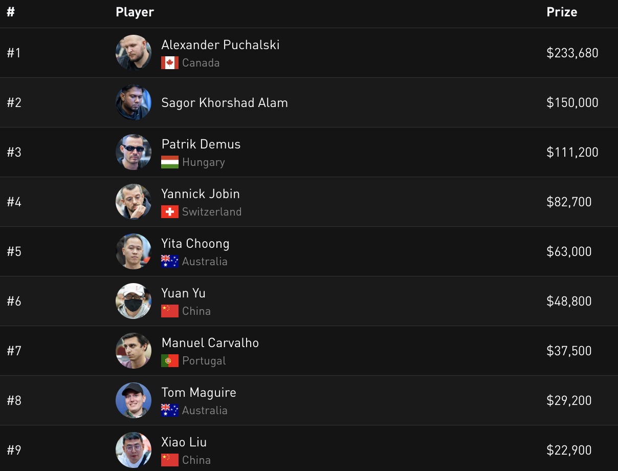 Im finalen Heads-up trafen Alexander Puchalski aus Kanada mit einem Stack von 18.400.000 (37BB) und Sagor Khorshad Alam aus Bangladesch mit 40.925.000 (82BB) aufeinander. Nach einem fast vierstündigen Duell setzte sich Puchalski durch und holte den Sieg. Bereits 2022 gewann er an diesem Ort die APPT Cambodia und sicherte sich damals $96.028. Diesmal kassierte er inklusive Ticket $233.680. Der Zweitplatzierte Sagor Alam erhielt $150.000.