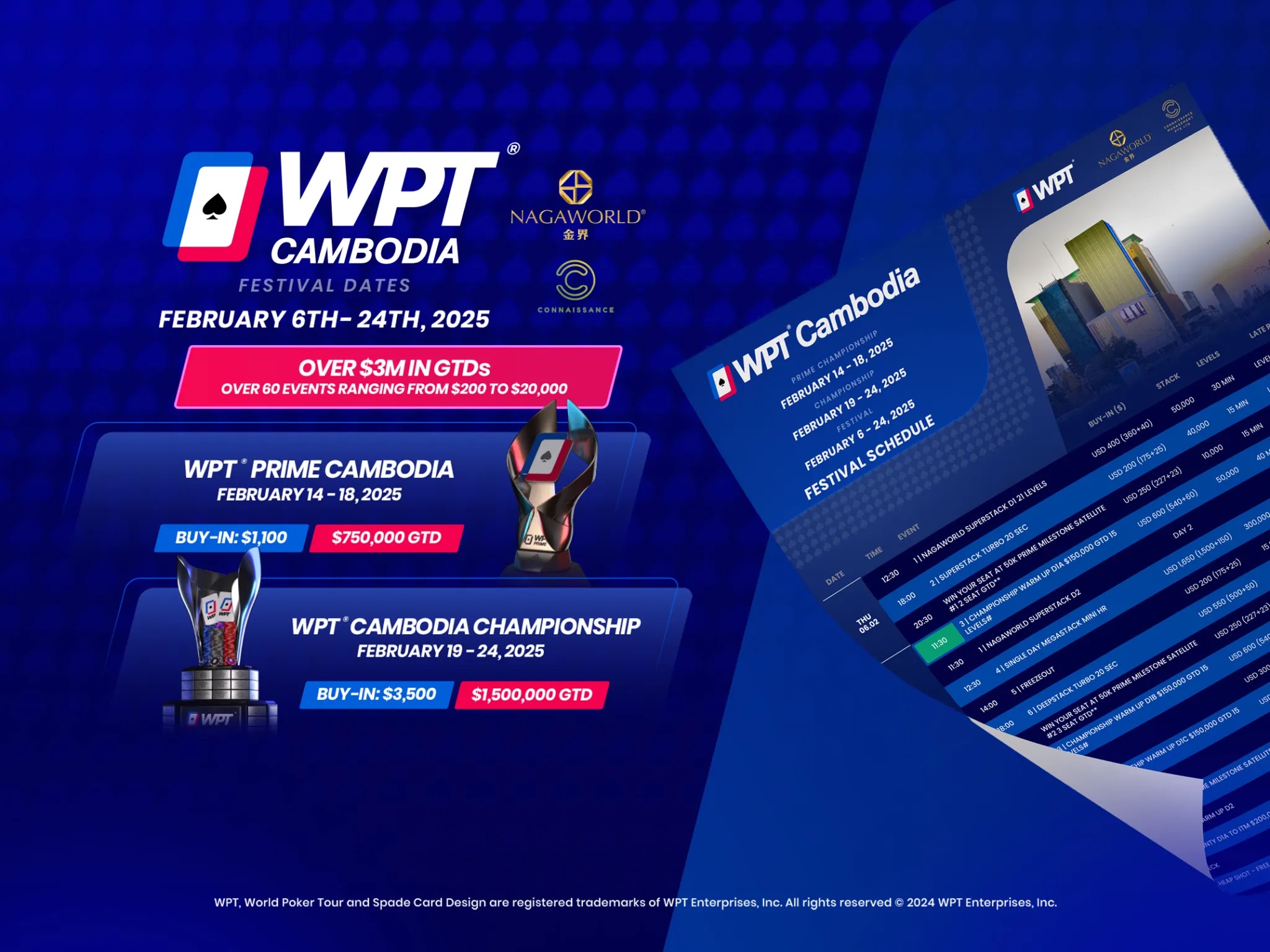 Vom 6. bis 24. Februar wird im NagaWorld Integrated Resort in Phnom Penh die WPT Cambodia ausgetragen, bei der 63 Turniere auf dem Programm stehen. Darunter das WPT Prime Cambodia mit einem Buy-in von $1.100 und einer garantierten Gewinnsumme von $750.000.