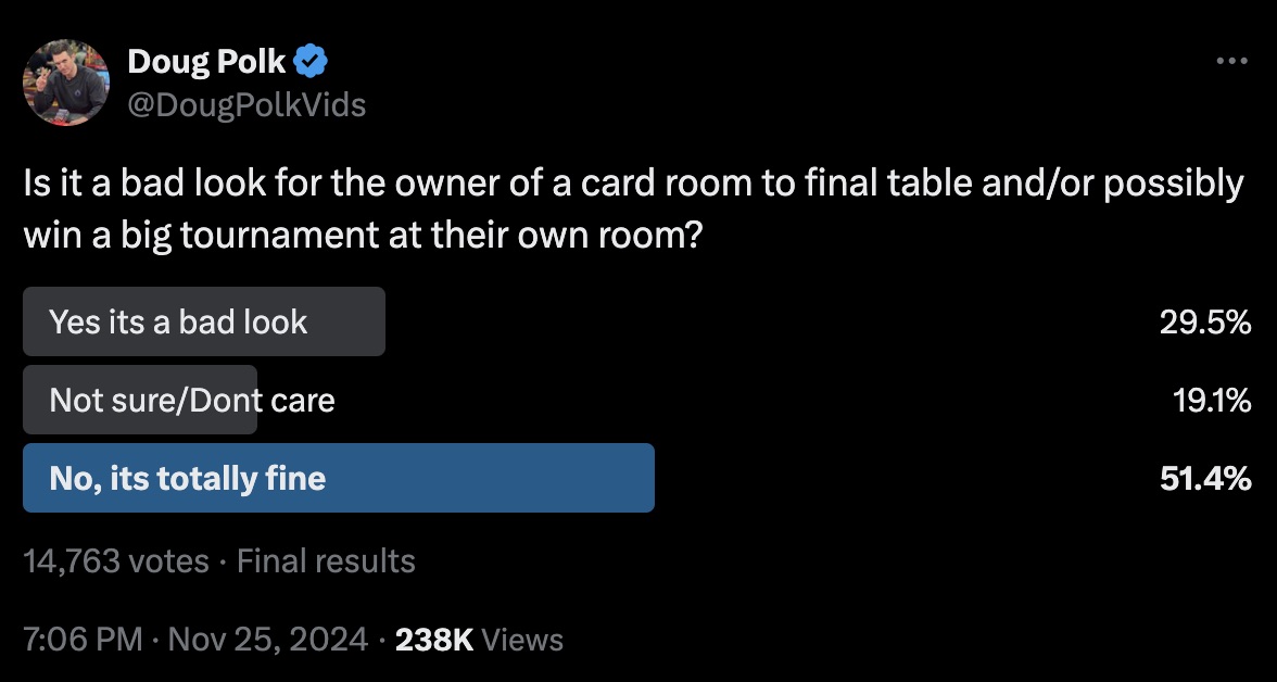 Doug selbst hat eine Umfrage im sozialen Netzwerk X (Twitter) durchgeführt, in der er die Leute fragte, ob sie es in Ordnung finden, dass ein Pokerraumbesitzer sein eigenes Turnier gewinnt. Viele Pokerräume in der Welt erlauben es den Besitzern eines bestimmten Pokerraums oder den Organisatoren einer Serie nicht, ihre Turniere zu spielen.