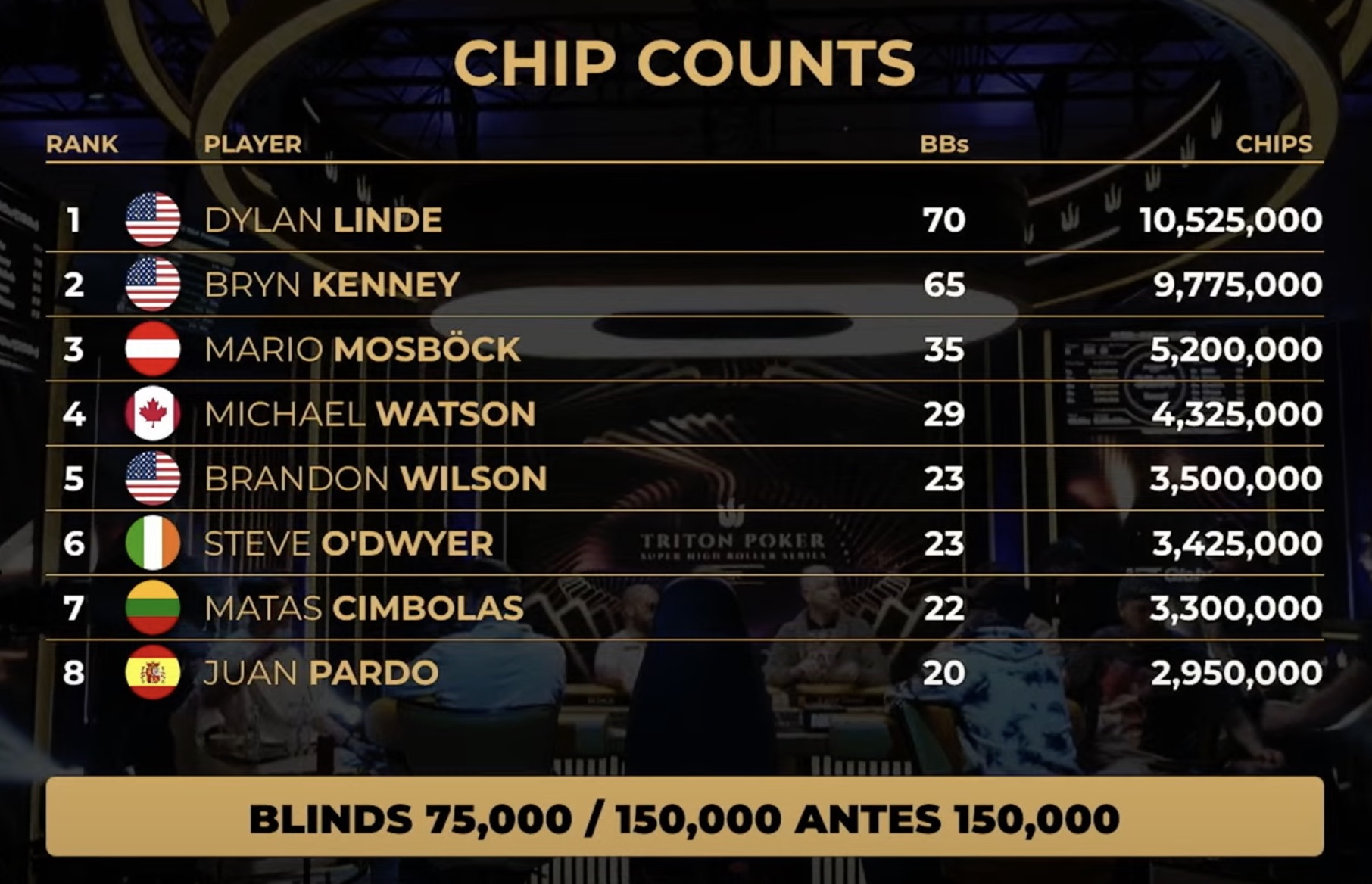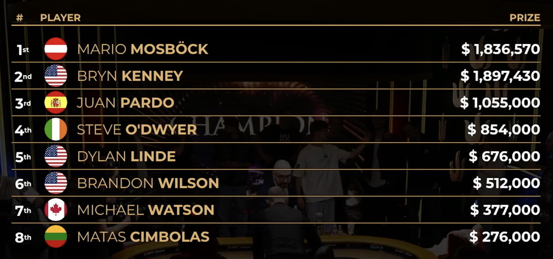 Trotz des ICM-Deals gab es noch $70.000 und eine Trophäe zu gewinnen. Das Heads-up dauerte nur fünf Hände, in denen Mosböck zuerst mit Pocket-Assen und dann mit drei Buben spielte, bevor er das Turnier mit Damen gewann. Mario Mosböck sicherte sich seinen dritten Triton-Titel und $1.836.570. Kenney, obwohl er nicht gewann, nahm immer noch mehr Geld mit nach Hause als Mosböck.