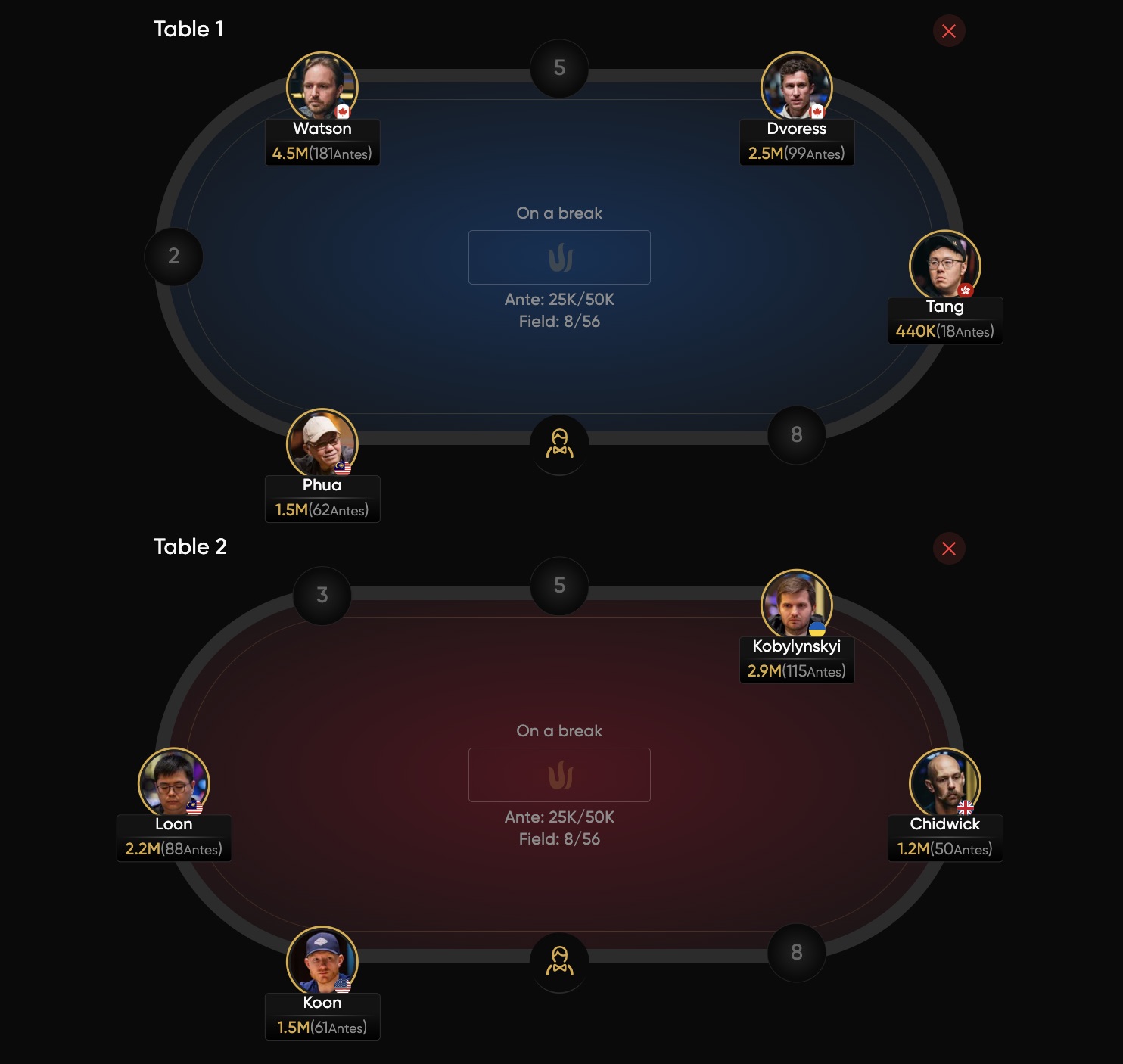 Bekannte Namen wie Alex Foxen, Nacho Barbero, Danny Tang, Stephen Chidwick und Lautaro Guerra schafften es an den Finaltisch. An der Spitze des Chipcounts stand Sam Greenwood mit einem Stack von 4.795.000 Chips (38 BB).