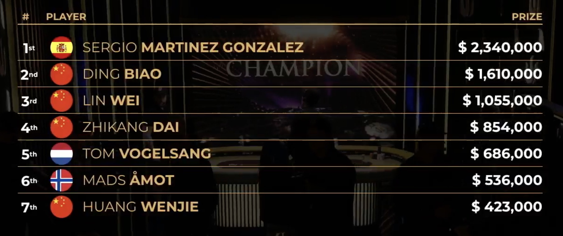 Im Heads-up sah alles nach einem Sieg für Bing Diao aus: Der Chinese startete mit 56 Blinds in die letzte Phase, während Sergio Martinez nur noch 20 Blinds hatte. Doch Martinez ließ sich nicht unterkriegen, kämpfte sich eindrucksvoll zurück und krönte sich mit der Rekordprämie von $2.340.000, seinem ersten Triton-Titel und einer Luxusuhr von Jacob & Co. Bing Diao wollte seinen dritten Triton-Titel holen, musste sich aber mit dem zweiten Platz und $1.610.000 geschlagen geben.