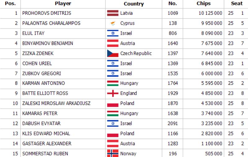 Der Finaltag beginnt heute um 16:00 Uhr, wo die letzten 15 Spieler auch vor den Kameras um den Titel kämpfen. Der Livestream ist für ca. 19:00 Uhr geplant, wenn der Finaltisch beginnen soll. Wie bereits erwähnt, ist der Chipleader des Finaltags Dmitrijs Prohorovs, mit einem Stack von 10.125.000 Chips – wird er derjenige sein, der sich über die €50.261 Gewinn freuen darf?