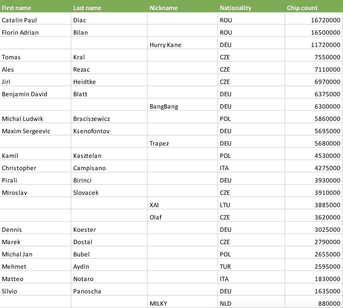 Am heutigen Finaltag nehmen 24 Spieler teil, angeführt vom Rumänen Catalin Diac mit einem Stack von 16.720.000. Knapp dahinter auf dem zweiten Platz liegt der ebenfalls rumänische Spieler Florin Bilan mit einem Stack von 16.500.000. Auf dem dritten Platz liegt der deutsche Spieler "Hurry Kane" mit einem Stack von 11.720.000. Insgesamt befinden sich noch acht Deutsche im Feld. Alle Spieler haben bereits mindestens €625 sicher.