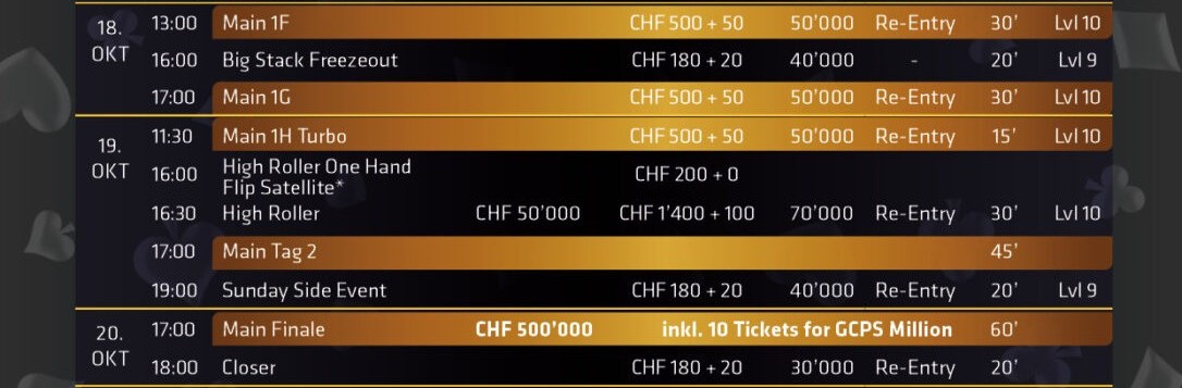 Nach fünf der acht geplanten Eröffnungs-Flights (1A bis 1E) wurden im CHF 500+50 GCPS Championship bereits 642 Entries verzeichnet (474 einzigartige Spieler + 168 Re-Entries) und der Prizepool ist auf 312.400CHF angewachsen. Das entspricht fast zwei Dritteln der garantierten 500.000CHF, sodass noch etwa 188.000CHF zur Erfüllung der Garantie fehlen.