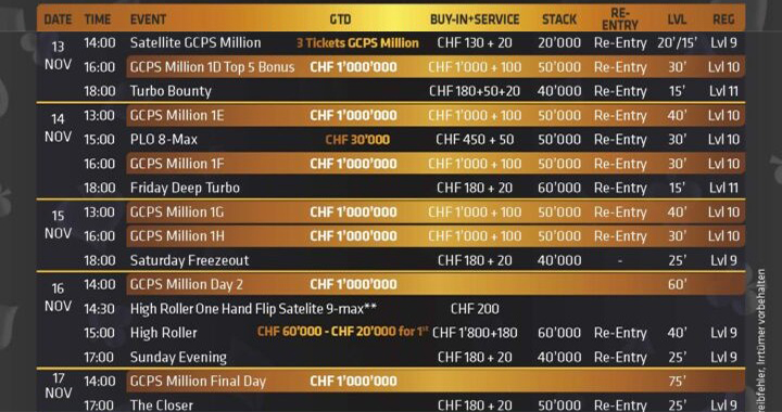 Diese Woche gipfelt die Serie in dem Event GCPS Million, das den Spielern eine Million Franken für ein Buy-in von 1.100CHF garantiert. Der massive Prizepool wird bereits an diesem Sonntag während des Day 2 verteilt, am Ende dessen wird die Besetzung des Finaltages für Montag bekannt sein.