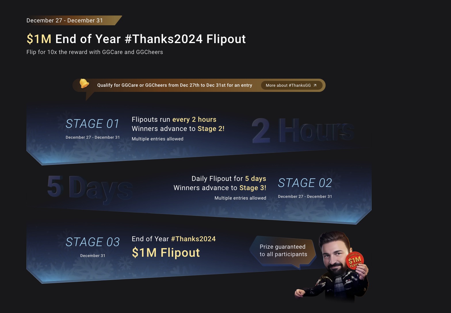 Zum Abschluss des Jahres veranstaltet GGPoker sein #Thanks2024 Flipout-Turnier, das vom 27. bis 31. Dezember läuft und an dem alle GGCheers- und GGCares-Qualifikanten in dieser Zeit teilnehmen können. Bei diesem rasanten, einzigartigen Format geht jeder Spieler bei jeder Hand automatisch All-In und kann sich so einen adrenalingeladenen Weg zu großen Preisen bahnen. Die Qualifikation ist einfach, und die Spieler, die es bis zur 3. Stufe schaffen, werden an einem Preispool von 1 Million Dollar teilhaben.
