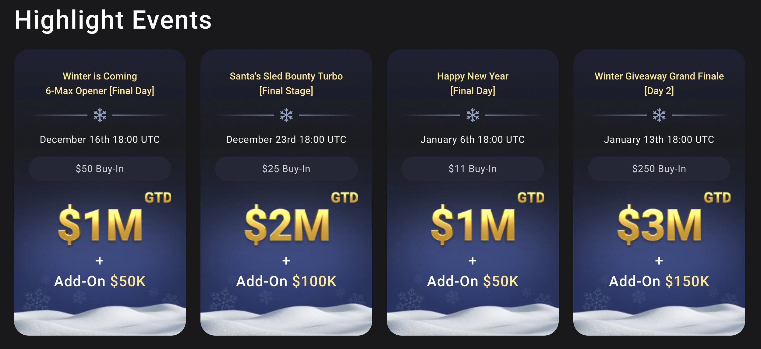 Zusätzlich zu den Main-Events wartet die Winter Giveaway Series mit einem vollen Turnierkalender auf, der Buy-ins für Spieler aller Levels umfasst. Von täglichen Herausforderungen bis zu spannenden GTD-Meisterschaften ist in dieser festlichen Saison für jeden etwas dabei.