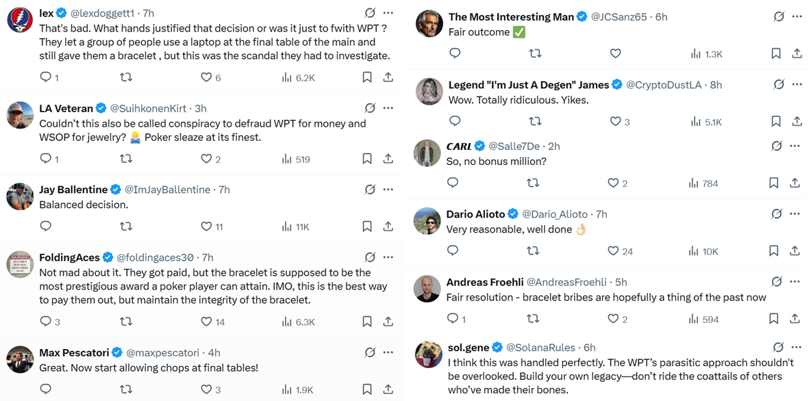 Insbesondere auf Plattform X (vormals Twitter) wurde nach dem Statement heftig diskutiert: Soll ein Spieler, der nicht offiziell als Sieger geführt wird und kein Bracelet bekommt, dennoch in den Genuss eines Bonus kommen? Einige machen die Veranstalter von ClubWPT Gold und WSOP für die ganze Situation verantwortlich – schließlich hätten ihre Promo-Aktionen solche Konstellationen erst möglich gemacht, jetzt aber werden die betroffenen Spieler sanktioniert, weil sie das Angebot wahrgenommen haben.