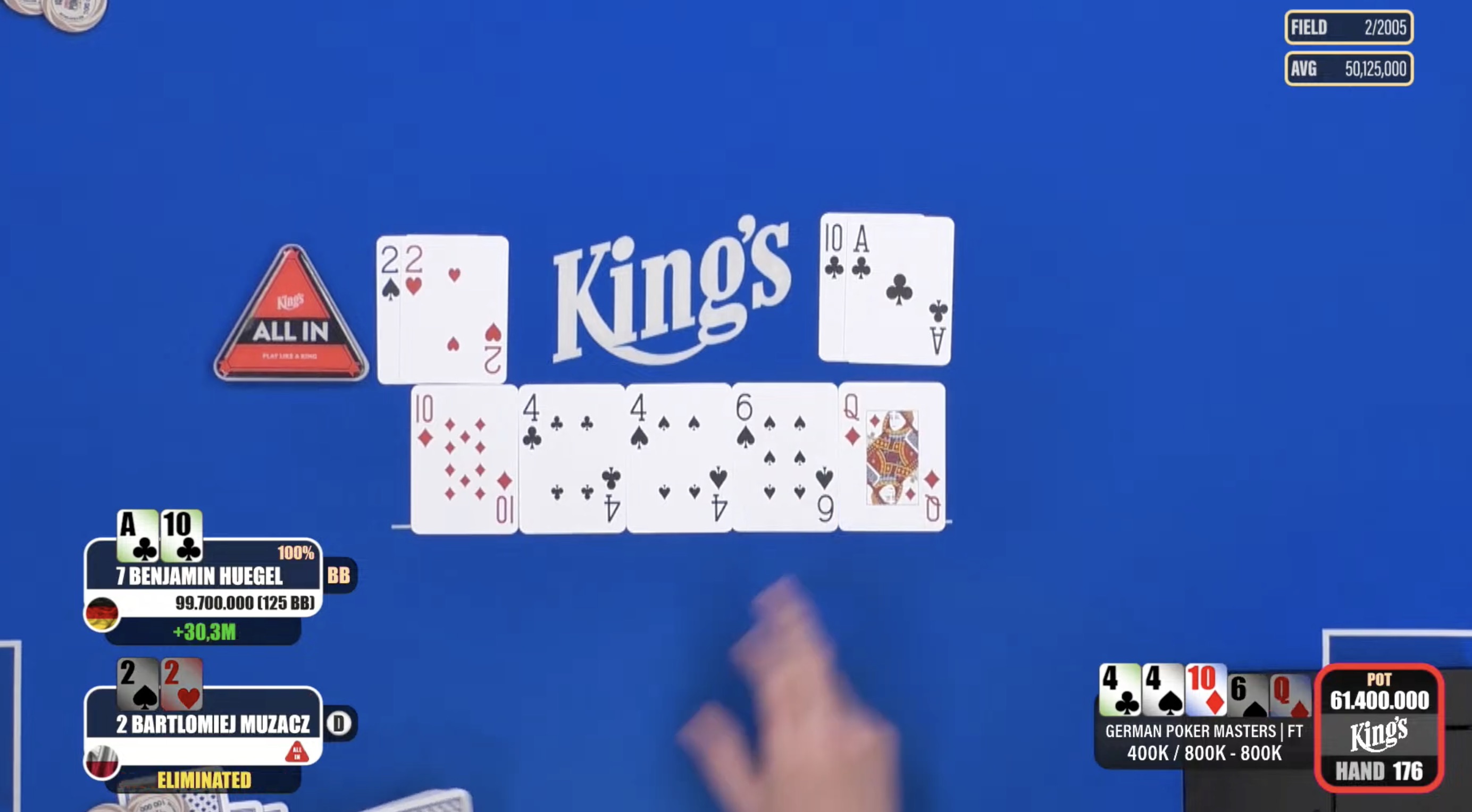 Bartlomiej Muzacz erreichte das finale Heads-up, in dem er gegen den deutschen Spieler Benjamin Huegel antrat. Huegel startete mit einem Stack von 59.400.000, während Muzacz 40.300.000 Chips vor sich hatte. Die Spieler einigten sich auf einen Deal und spielten anschließend noch um die Trophäe. Der Sieg ging an Benjamin Huegel, der nach dem Deal €53.730 mit nach Hause nahm. Muzacz erhielt für seinen zweiten Platz €39.770.