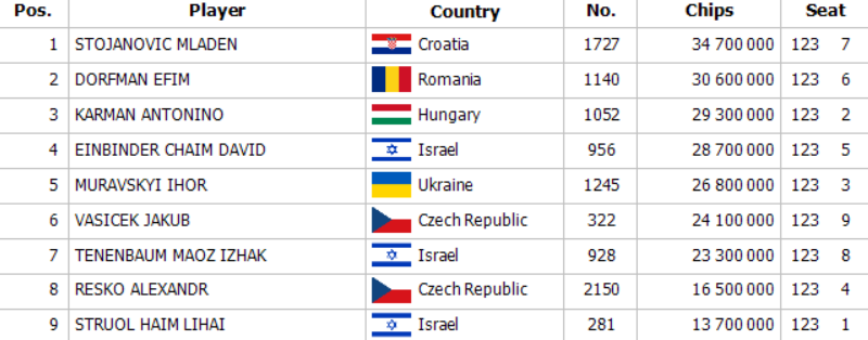 Der erste, der den Finaltisch verlassen musste, war der tschechische Vertreter Alexandr Resko, der 5.275€ mit nach Hause nahm. Der zweite von den tschechischen Spielern, Jakub Vašíček, schaffte es etwas weiter und erhielt für seinen siebten Platz 9.425€. Nach dem Ausscheiden des israelischen Spielers Chaim David Einbinder einigte sich die letzte Dreiergruppe auf einen Deal.