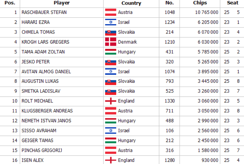 Stefan Raschbauer aus Österreich ist derzeit der deutliche Chipleader, denn er hat als einziger die 10-Millionen-Chipmarke überschritten.