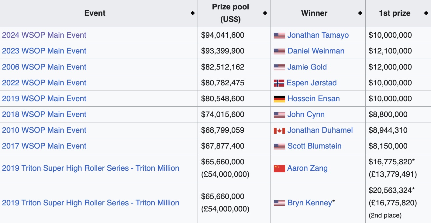 Wenn es um Preispool-Rekorde geht, hat auch die WSOP die Nase vorn – 8 ihrer Main Events befinden sich in den Top 10! Die Plätze neun und zehn werden von der Triton SHR-Serie belegt. An der Spitze steht das $10.000 WSOP Main Event 2024, das mit unglaublichen 10.112 Teilnehmern einen gewaltigen Preispool von bis zu $94.041.600 erschuf. Las Vegas wartet auf die nächste Ausgabe der WSOP, die vom 27. Mai bis 16. Juli stattfinden wird.