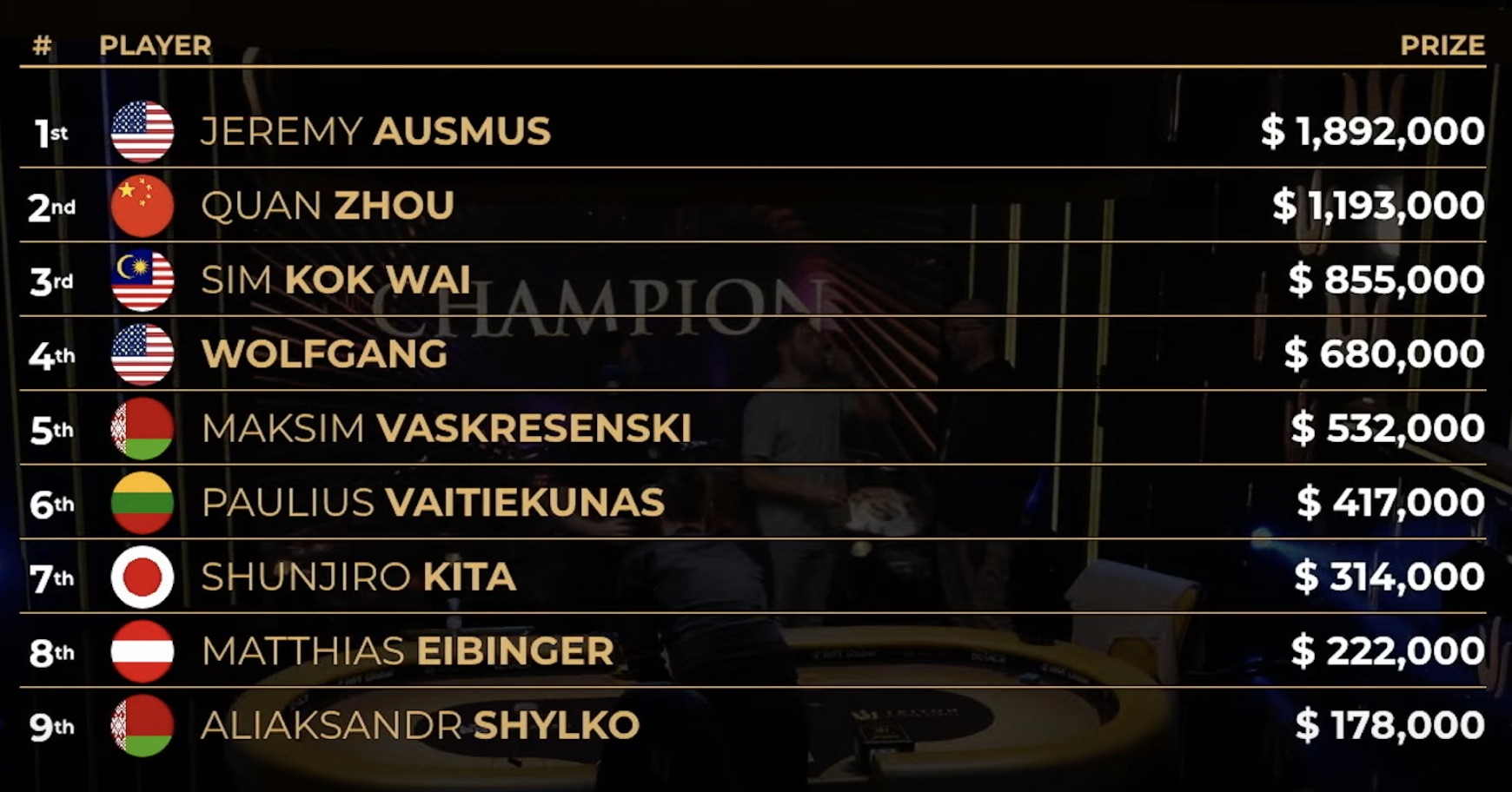 Jeremy Ausmus und der chinesische Spieler Quan Zhou trafen im letzten Heads-up-Match aufeinander. Quan begann hier als Chipleader mit einem Stack von 47.900.000 (30 bb), während Jeremy einen Stack von 30.400.000 (19 bb) hatte. Jeremy Ausmus brauchte nur eine Hand, um die Chipleader-Position zu übernehmen und er ließ sich die Chance auf seinen ersten Triton-Titel nicht entgehen. Am Ende nahm Jeremy die Trophäe und das Gesamtpreisgeld von $1.892.000 mit nach Hause.