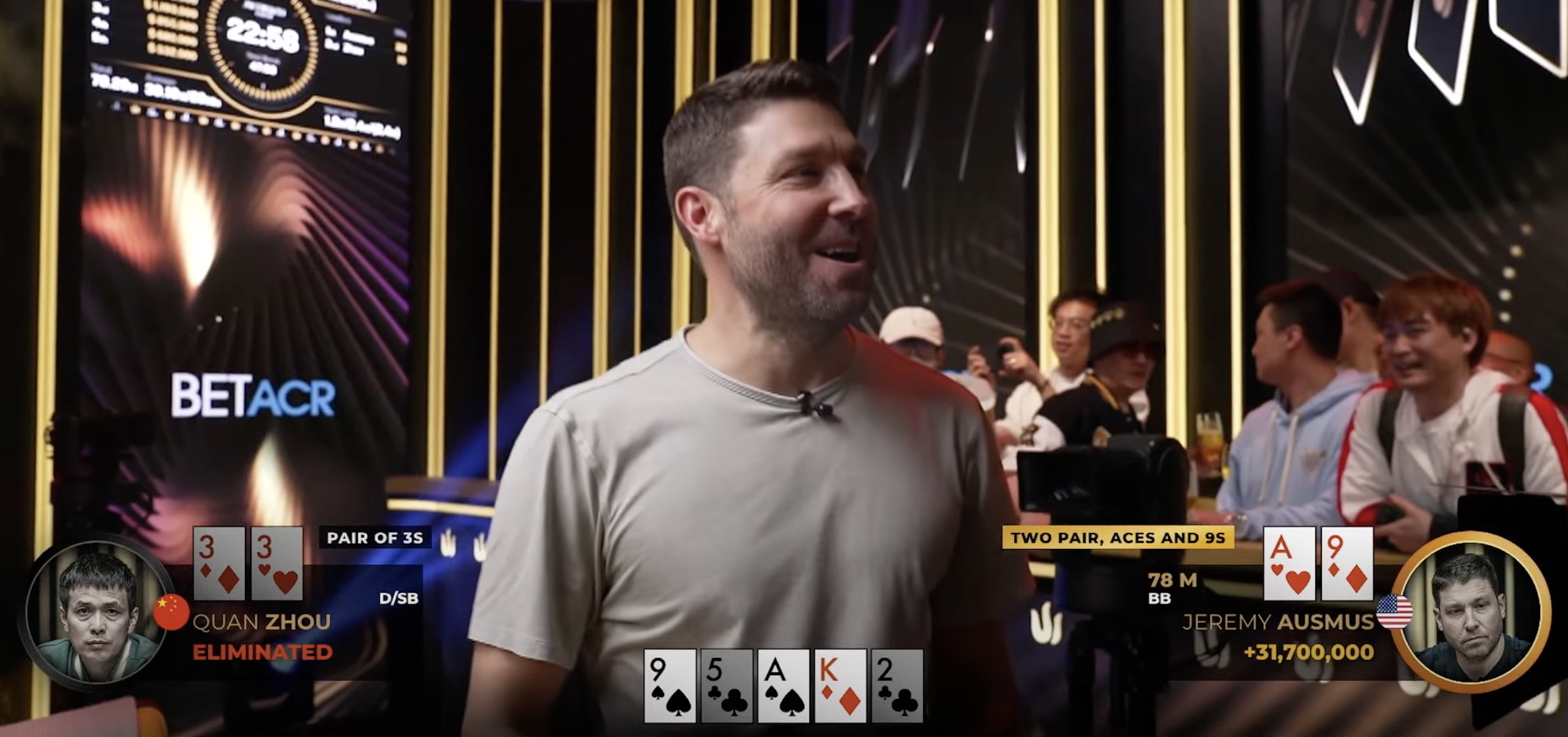 Bleiben wir aber noch einen Moment bei Jeremys Namen, denn diese Leistung wäre vielleicht nicht möglich gewesen, wenn er nicht einen Fehler gemacht hätte, während er in einem 23-Spieler-Feld spielte. Mit K-K auf der Hand wollte Jeremy vor dem Flop erhöhen, aber er warf den falschen Einsatzbetrag über die Linie und war gezwungen, einfach mitzugehen. Er ahnte nicht, dass dieser Zug ihm einen großen Teil seines Stacks ersparte, da Aliaksandr Shylko Asse fand.