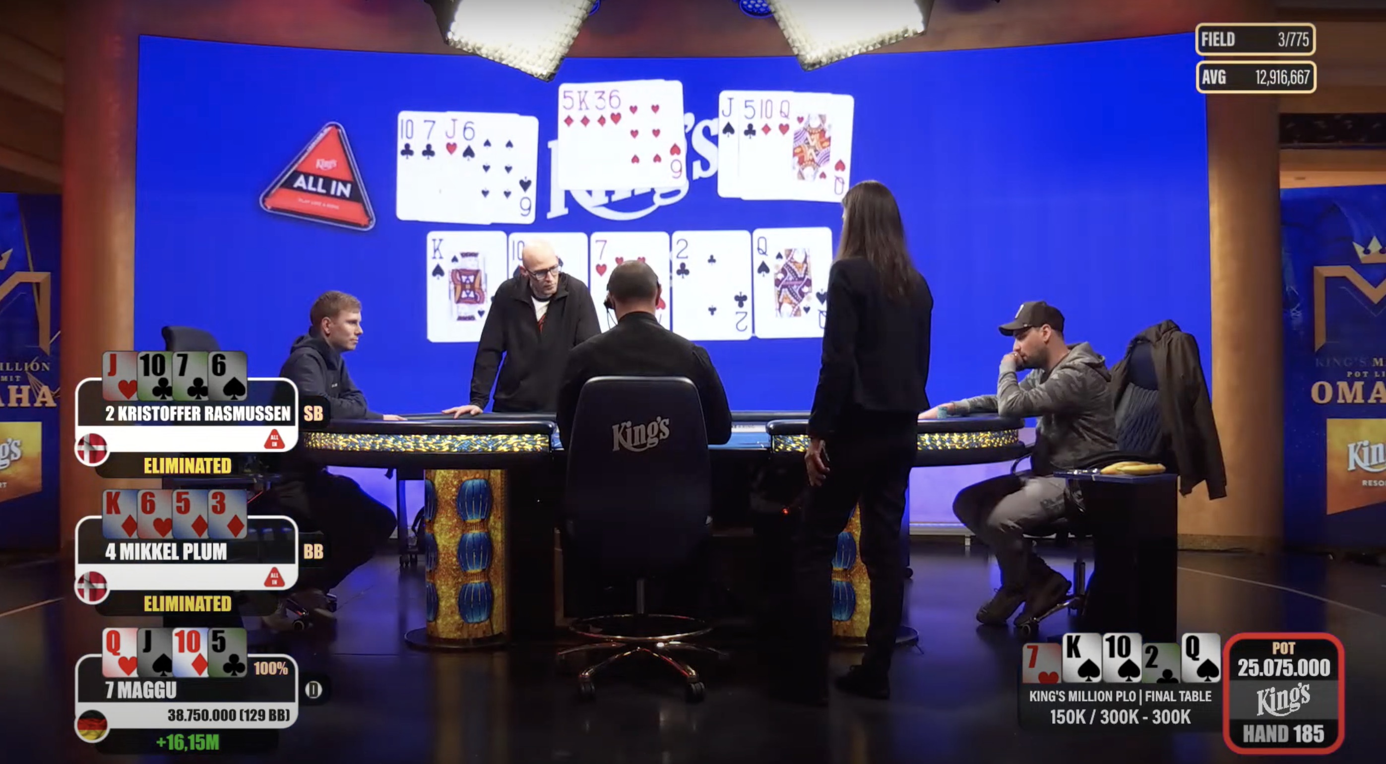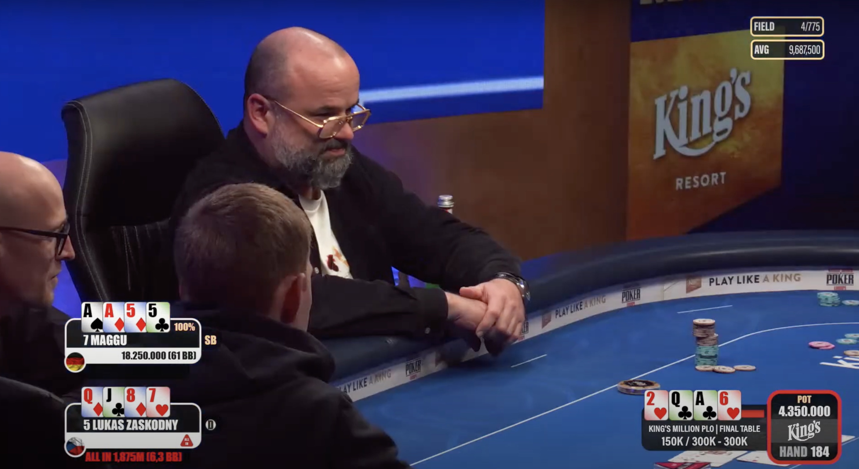 Der tschechische Spieler Lukáš Záškodný schied schließlich auf dem vierten Platz aus, wofür er ein Preisgeld von €54.000 erhielt. Nach seinem Ausscheiden einigten sich die letzten drei Spieler auf einen Deal, woraufhin wir nur noch eine Hand sahen. In dieser kam es zu einem 3-Way-All-in, aus dem der deutsche Spieler Maggu als Sieger hervorging. Er nahm nach dem Deal €150.625 mit nach Hause.
