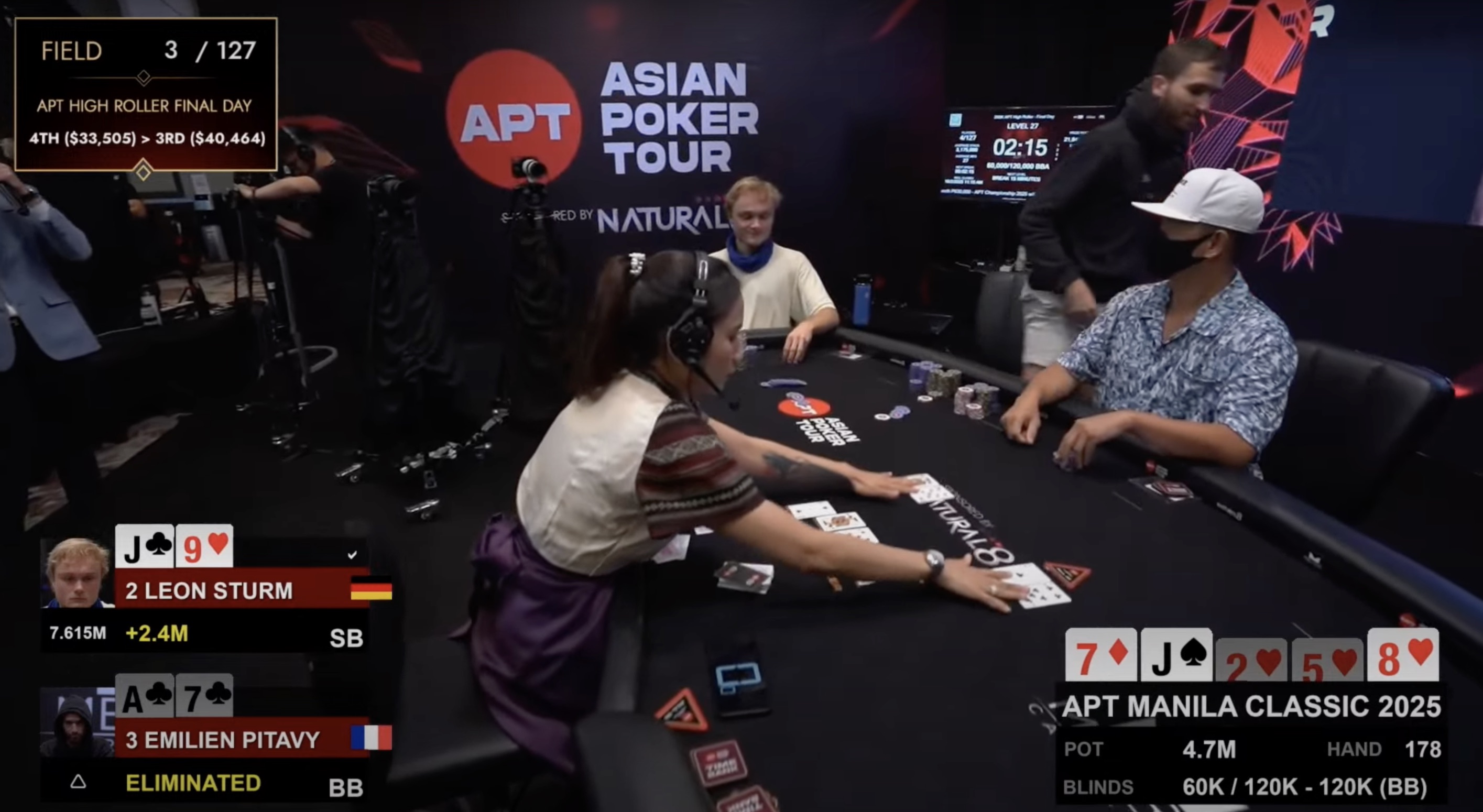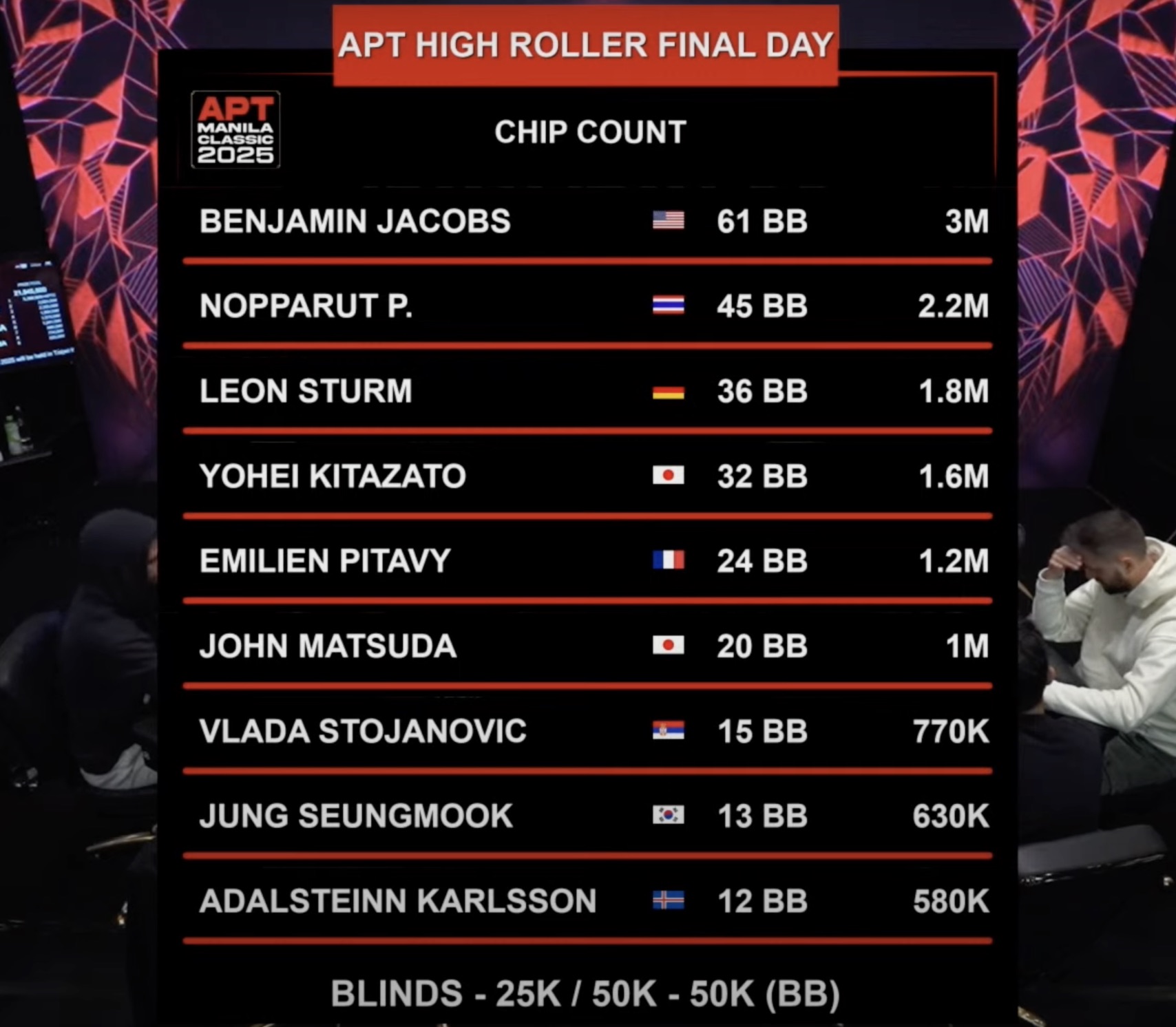 Benjamin Jacobs hielt weiterhin die Chipleader-Position, doch mit dem Ausscheiden von Emilien Pitavy auf Platz vier wendete sich das Blatt. Leon Sturm übernahm die Führung und baute seinen Stack auf beeindruckende 7,6 Millionen aus, während seine beiden verbleibenden Gegner gemeinsam nur 5,2 Millionen Chips hatten.