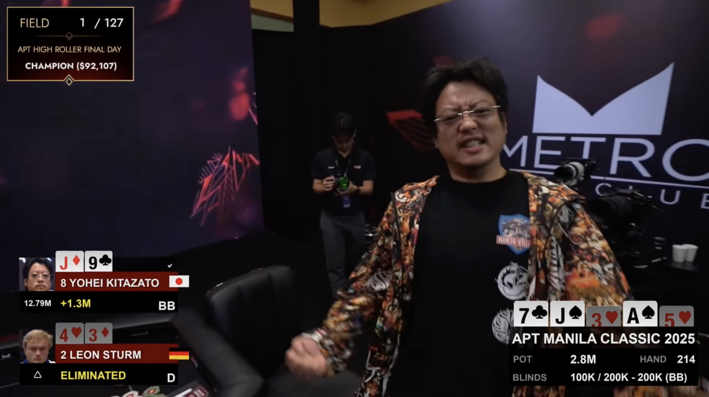 Nach etwa 45 Minuten Heads-up war Leon Sturm auf 5 Blinds heruntergespielt und pushte All-in. Sein Gegner callte und gewann mit der besseren Hand nach dem Board. Damit belegte Leon den zweiten Platz und erhielt €60.000. Yohei Kitazato holte sich den Sieg, €88.749 Preisgeld und ein Ticket im Wert von €10.430 für die APT Taipei Championship im November.