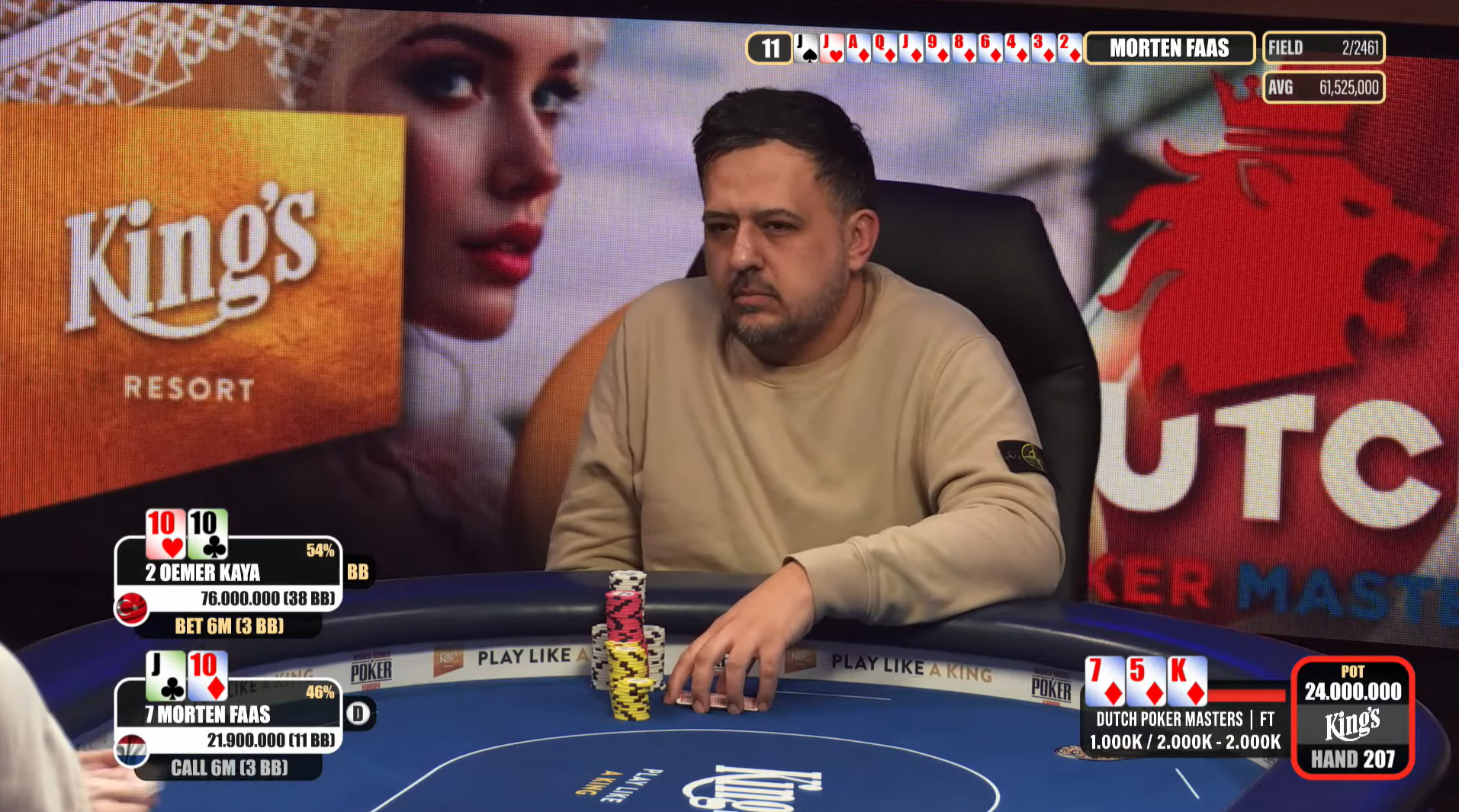 Der niederländische Spieler ging mit leichtem Vorsprung in das Heads-up, doch Kaya übernahm schnell die Kontrolle. In der entscheidenden Hand ging Kaya mit T h T c all-in nach dem Turn. Das Board 7 d 5 d K d Q h gab Faas mit J c T d Chancen auf eine Straße und einen Flush, was ihn überzeugte, alle Chips in die Mitte zu schieben. Der River 3 s entschied jedoch den Sieg für Kaya.