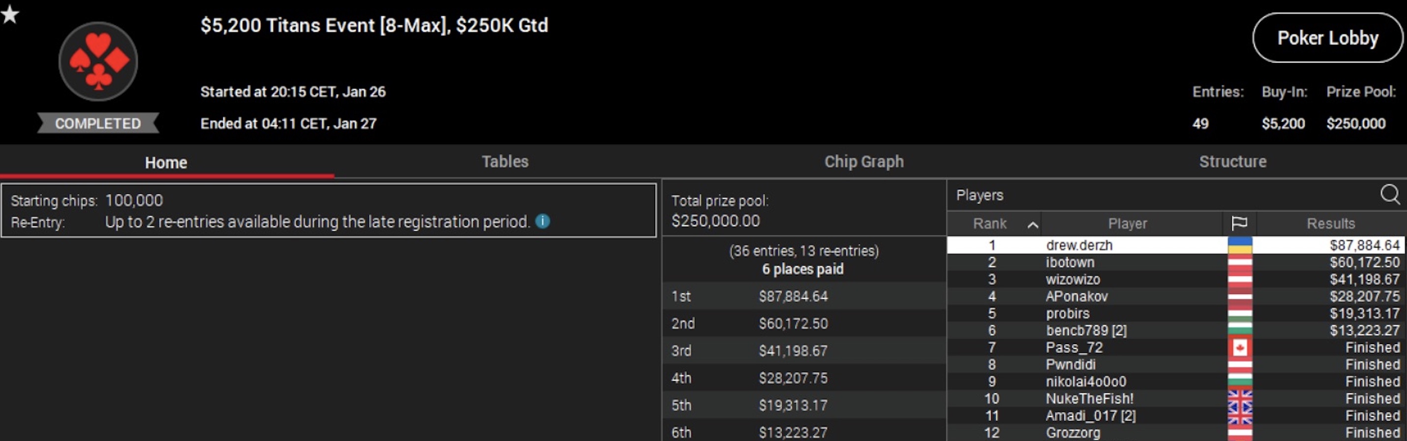 Das $5.200 Titans Event fand ebenfalls in dieser Woche statt und erreichte 49 Entries sowie einen Preispool von $250.000. Der zweite Platz ging an "ibotown", der $60.172 verdiente, während Ole "wizowizo" Schemion den dritten Platz belegte und $41.198 mit nach Hause nahm.
