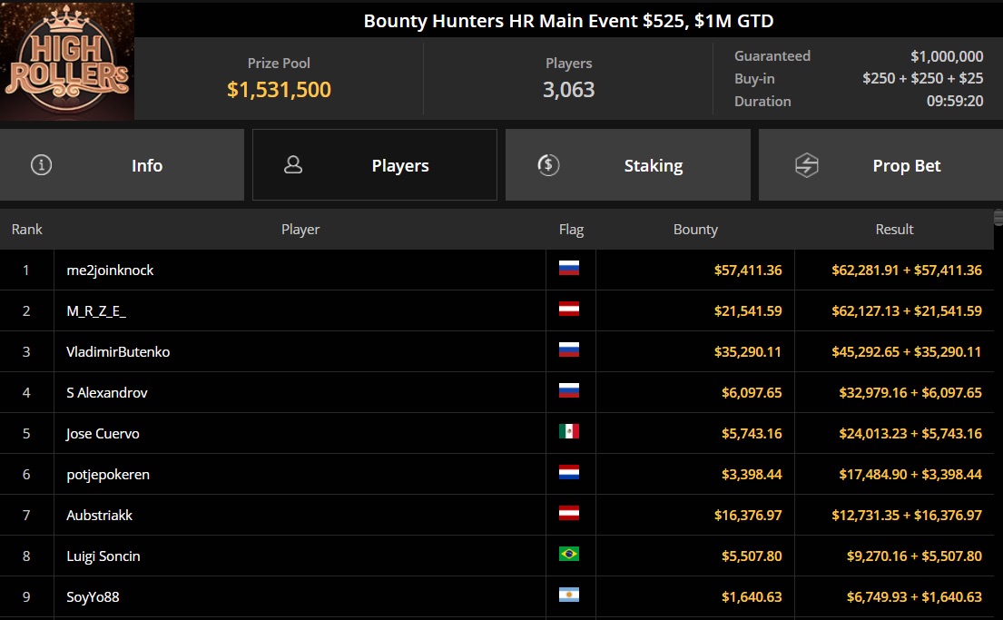 Auch "M_R_Z_E_" aus Österreich feierte einen großartigen Erfolg und belegte den zweiten Platz beim Bounty Hunters HR Main Event mit einem Buy-in von $525. Bei 3.063 Entries und einem Preispool von $1.531.500 sicherte sich der österreichische Spieler $83.668.