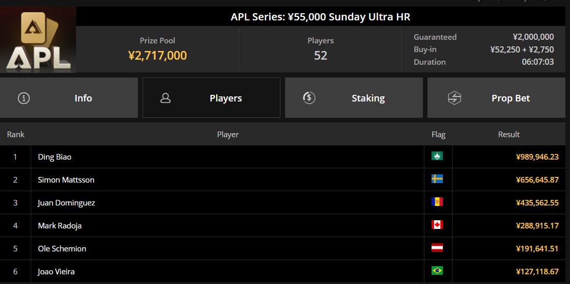 Das dritte Turnier, bei dem Ole erfolgreich abschnitt, war das Sunday Ultra HR in der APL Series. Mit einem Buy-in von $7.585 und einem Preispool von $374.696 kämpften 52 Teilnehmer um den Sieg. Ole belegte den fünften Platz und kassierte $26.429. Insgesamt hat er in diesen drei Turnieren $105.036 verdient.