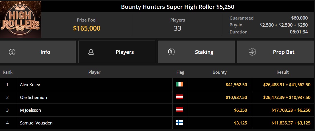 Auch beim Bounty Hunters SHR, einem Turnier mit einem Buy-in von $5.250 und einem Preispool von $165.000, konnte Ole "wizowizo" Schemion glänzen. Bei 33 Teilnehmern landete er auf dem zweiten Platz und kassierte $37.409.