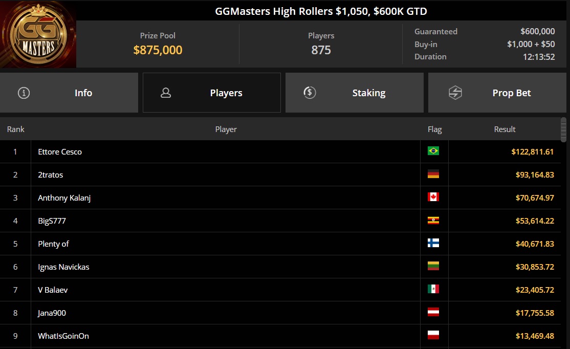 Ein weiterer starker DACH-Erfolg gelang "2tratos" aus Deutschland. Beim GGMasters High Rollers ($1.050 Buy-in) schaffte er es unter 875 Teilnehmern auf den zweiten Platz. Dafür kassierte er beeindruckende $93.164 aus dem Gesamtpreispool von $875.000.