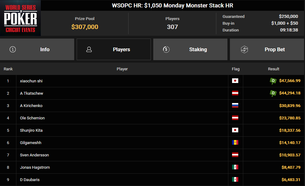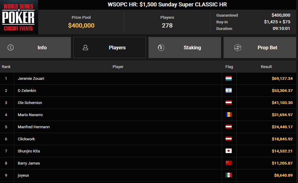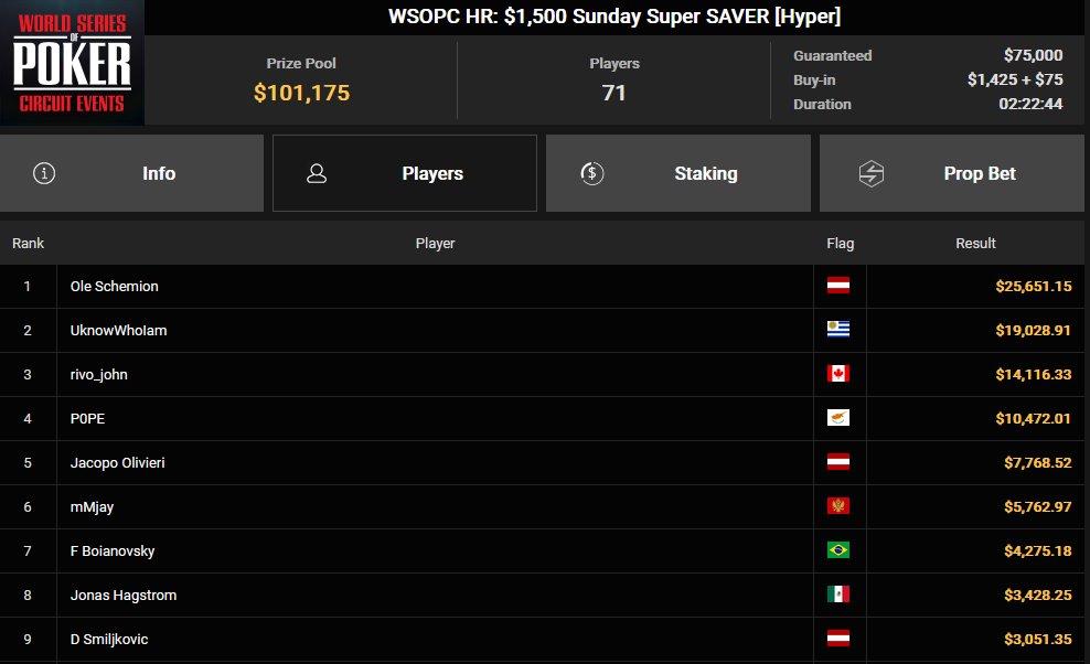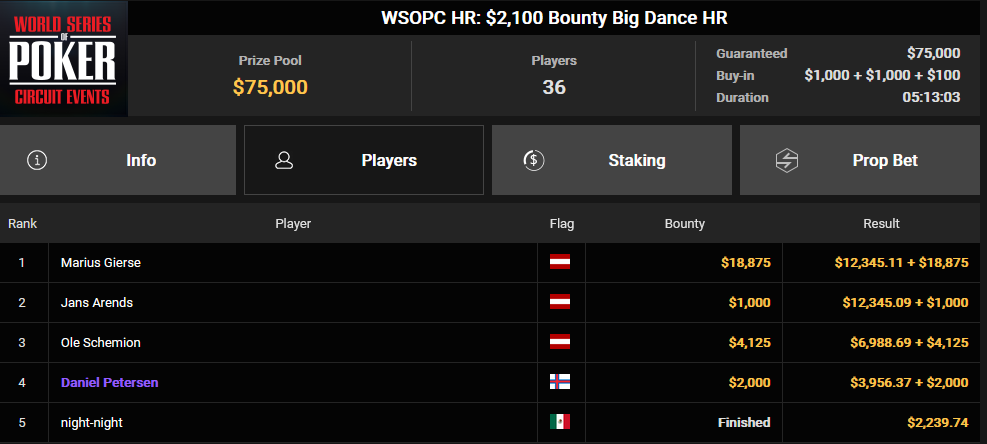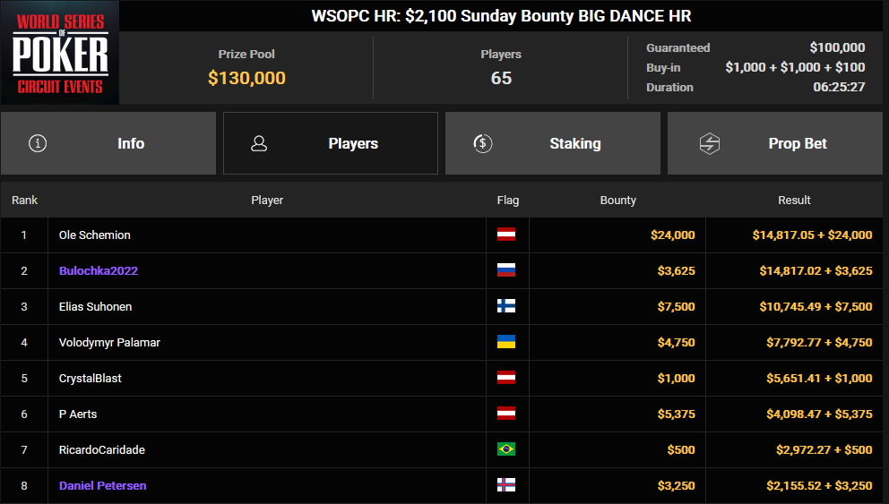 In unserem heutigen Artikel stehen diese Turniere im Mittelpunkt, aber sie sind nicht die einzigen Highlights. Schauen wir uns zunächst Ole Schemion an, der bei fünf verschiedenen Turnieren Preisgelder kassierte. Das größte war der 3. Platz beim WSOPC HR: $1.500 Sunday Super Classic HR, mit einem Gewinn von $41.103. Beim WSOPC HR: $2.100 Sunday Bounty BIG DANCE HR sicherte er sich als Sieger $38.817. Insgesamt nahm Ole $140.466 aus den fünf Turnieren mit nach Hause.
