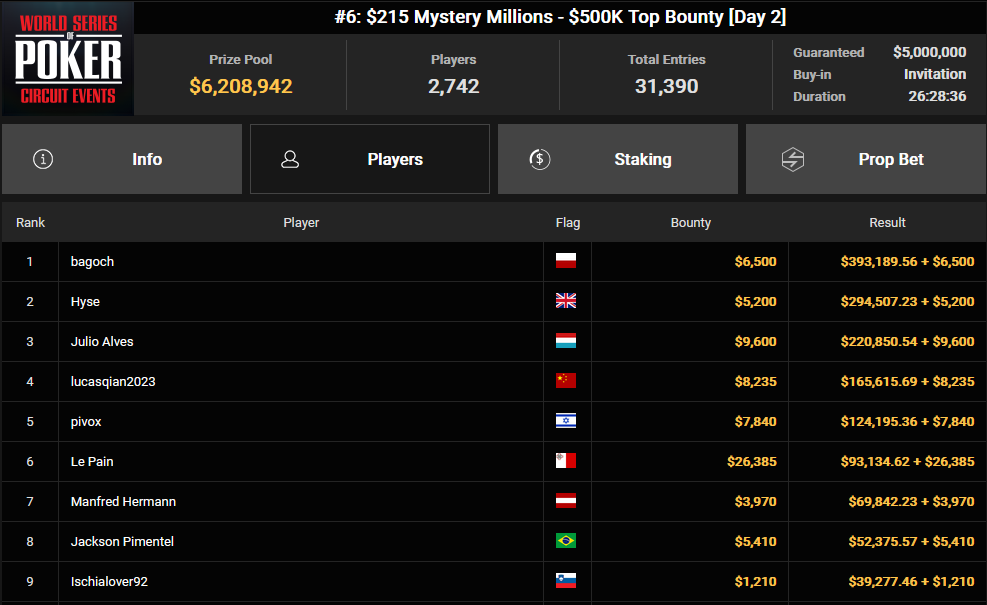 Schließlich haben wir noch einen deutschen Spieler, den man vielleicht auf einem der Screenshots oben gesehen hat – Manfred Hermann. Er nahm zunächst $24.440 aus einem Turnier mit, bei dem Ole Schemion über 41.000 gewann. Danach erreichte Hermann den Finaltisch des Mystery Millions-Ringturniers mit einem Buy-in von $215, 31.390 Teilnehmern und einem Preispool von $6.208.942. Manfred belegte den 7. Platz und sicherte sich $73.812 inklusive seiner gesammelten Bountys.
