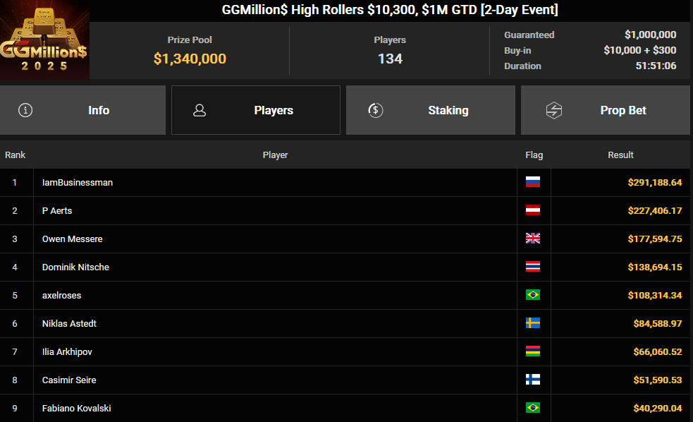 Ein weiterer bekannter Name ist Dominik Nitsche, der gestern am GGMillion$-Finaltisch saß. Das Turnier hatte ein Buy-in von $10.300, 134 Teilnehmer und einen Preispool von $1.340.000. Dominik beendete das Turnier auf dem 4. Platz und gewann $138.694. Auch der schwedische Profi Niklas Astedt war dabei und belegte den 6. Platz für $84.589.