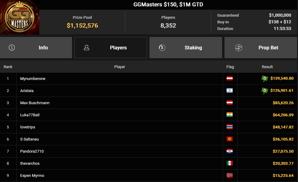 GGPoker präsentierte uns ein neues reguläres Sonntagsturnier namens GGMasters, das ein Buy-in von $150 und eine Garantie von $1.000.000 bietet. Es handelt sich um ein Freezeout-Turnier, bei dem man nur eine einzige Chance hat, zu gewinnen. Der erste Gewinner war der österreichische Spieler "Mynumberone", der nach einem Deal $139.540 mit nach Hause nahm.
