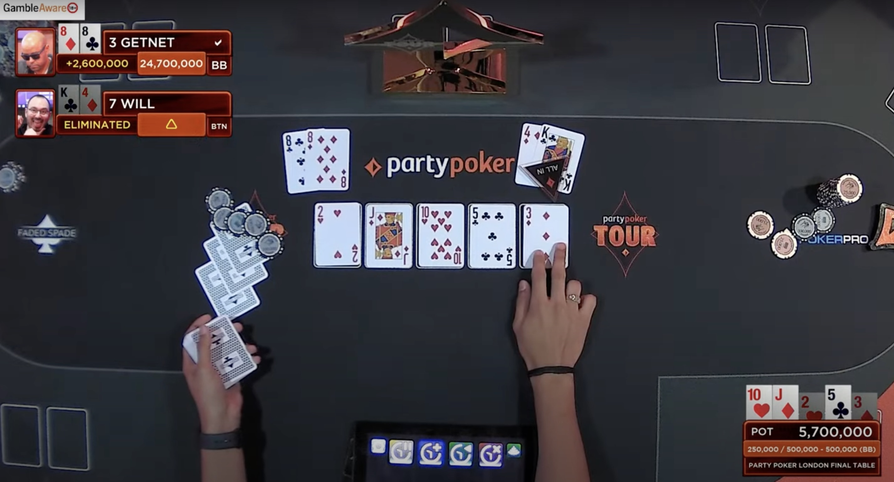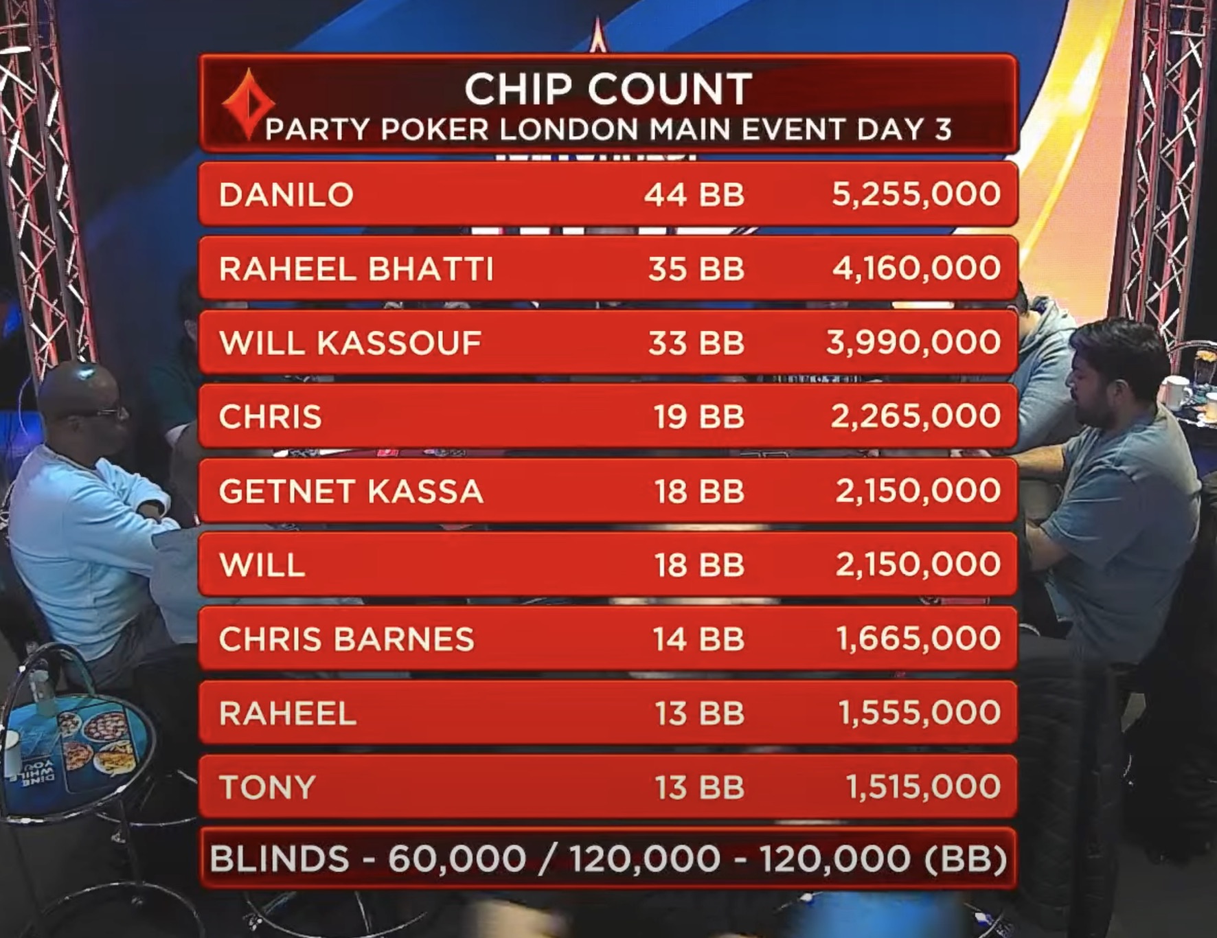Prominentester Finalist war Will Kassouf, der mit dem drittgrößten Stack an den Finaltisch kam. An der Spitze des Chipcounts stand jedoch Danilo mit 5.255.000 Chips.
