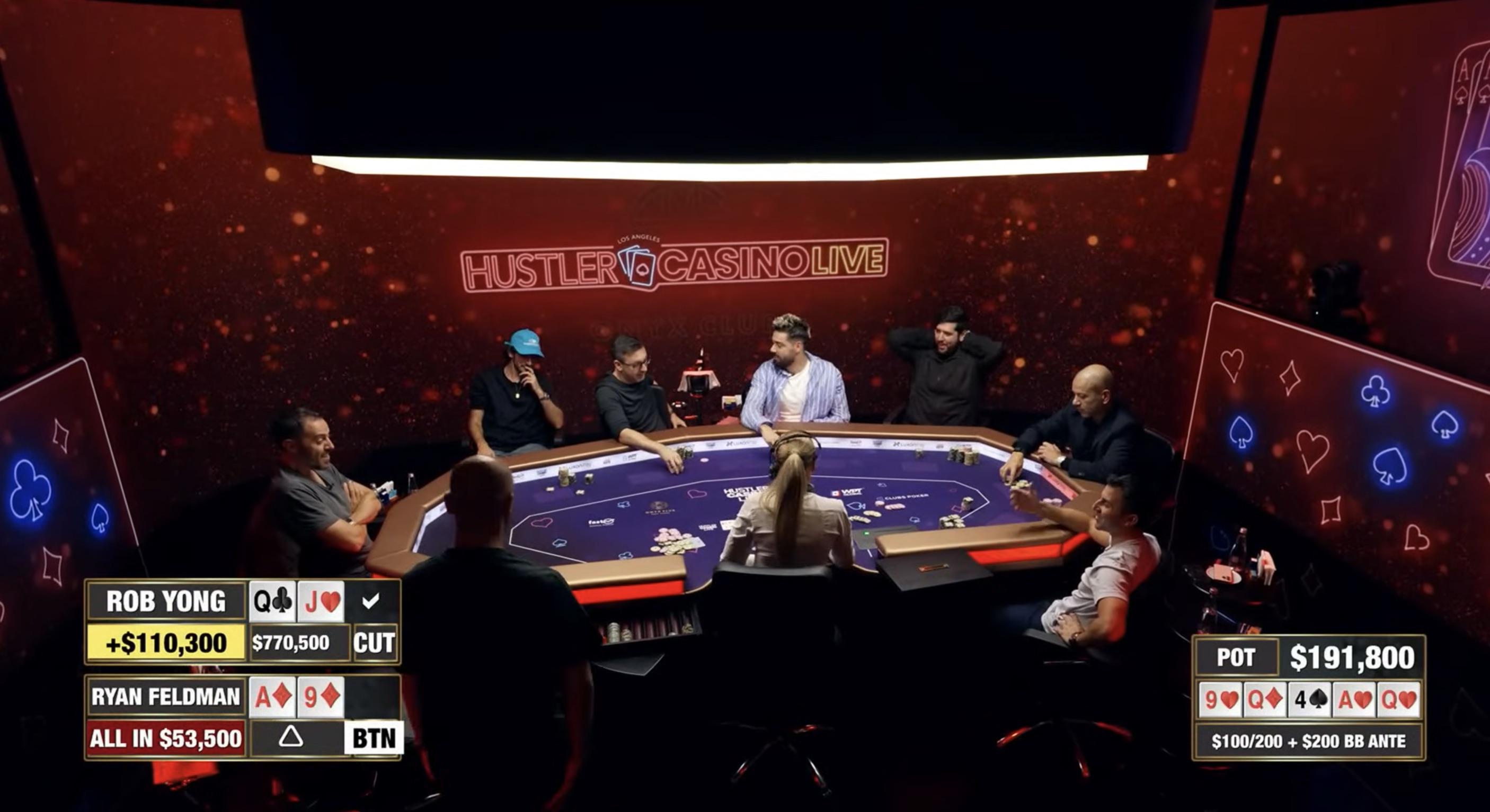 Schon in den ersten Tagen hat HCL die ganze Aufmerksamkeit der Pokerwelt auf sich gezogen, und das alles dank der unglaublichen Hand, die Rob Yong und Ryan Feldman gespielt haben. Rob Yong fand Q-J under the gun und Ryan Feldman fand A-9. Sinan war zunächst auch mit K-K in der Hand, aber er foldete schließlich, nachdem das Board Q-9-4-A zeigte. Feldman entschied sich, nach dem Turn für $53.500 All-In zu gehen, was Rob Yong gerne mitging. Nichts Interessantes bis zu diesem Punkt, eine Standardhand.