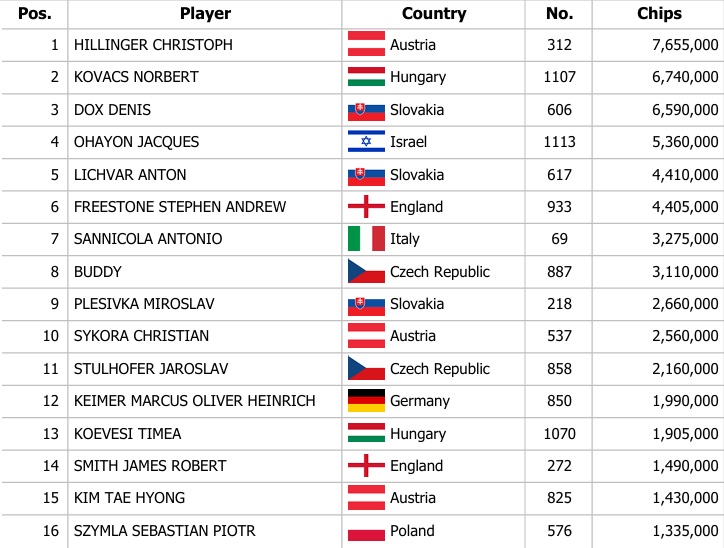 Der zweite Tag hatte die Aufgabe, das Teilnehmerfeld auf die letzten 16 Finalisten zu reduzieren, die um die größten Gewinne kämpfen werden. Nach stundenlangem intensiven Poker sind die Finalisten bekannt. Chipleader im Finaltag wird der österreichische Spieler Christoph Hillinger mit einem Stack von 7,6 Millionen Chips sein. An zweiter Stelle der Chips steht der ungarische Vertreter Norbert Kovács, und den dritten Platz belegt Denis Dox.