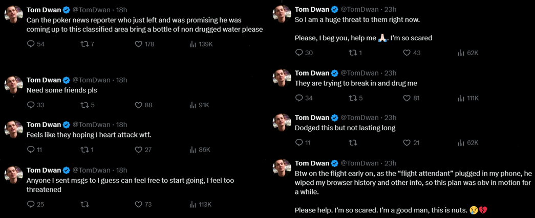 Eine Serie von Alarmmeldungen ging dann den ganzen Mittwoch weiter, in denen Tom unter anderem die Nummer seines Zimmers teilte, in dem er angeblich gegen seinen Willen festgehalten wird. Er flehte die Menschen an, ihm zu helfen, die nächsten Stunden zu überleben, da er überzeugt sei, dass sie ihn unter Drogen setzen und „sein Gehirn töten“ wollen. Er behauptete, sie hätten Zugriff auf sein Handy und würden Nachrichten löschen, und als ein Reporter von Poker News ihm ein Treffen anbot, bat er diesen, „reines Wasser ohne jegliche Drogen“ zu bringen.