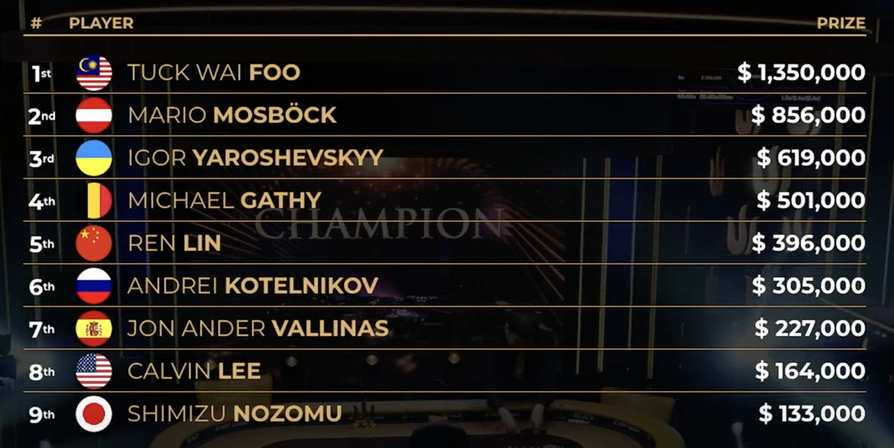 Am Finaltisch kämpften Namen wie Ren Lin, Igor Yaroshevskyy und Mario Mosböck um das größte Preisgeld. Keiner von ihnen konnte jedoch den malaysischen Amateur namens Tuck Wai Foo aufhalten, für den dies die erste Station der Triton-Serie ist. Foo trat im Heads-up-Match gegen den österreichischen Profi Mario Mosböck an, um seine erste Triton-Trophäe und ein Preisgeld von $1.350.000 zu gewinnen. Mario Mosböck erhielt $856.000 für seinen zweiten Platz.