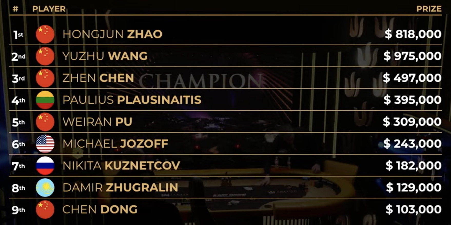 Die ersten drei Plätze wurden schließlich von Spielern aus China belegt und der Sieger nach dem Heads-up war Zhao Hongjun, der die Trophäe und schließlich $818.000 mit nach Hause nahm. Obwohl Zhao der Sieger war, ging der größte Geldpreis an Yuzhu Wang, der $975.000 erhielt.