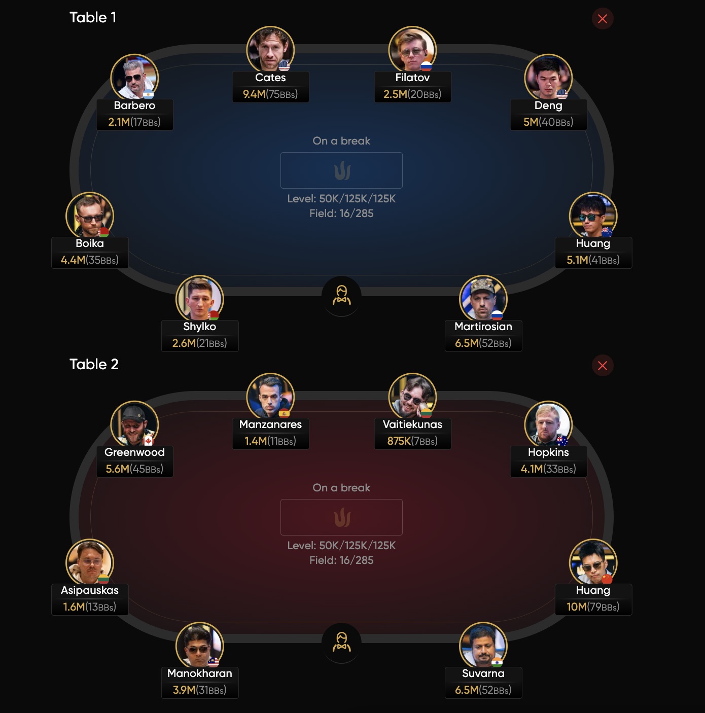 Alle 16 verbliebenen Spieler haben sich bereits mindestens $336.000 gesichert. Angeführt wird das Feld vom Chinesen Huang Wenjie mit 9.875.000 Chips, dicht gefolgt von Dan "Jungleman" Cates mit 9.375.000. Am Finaltag dabei sind außerdem Santhosh Suvarna, Artur Martirosian, Sam Greenwood, Aliaksandr Shylko, Anatoly Filatov und Nacho Barbero.