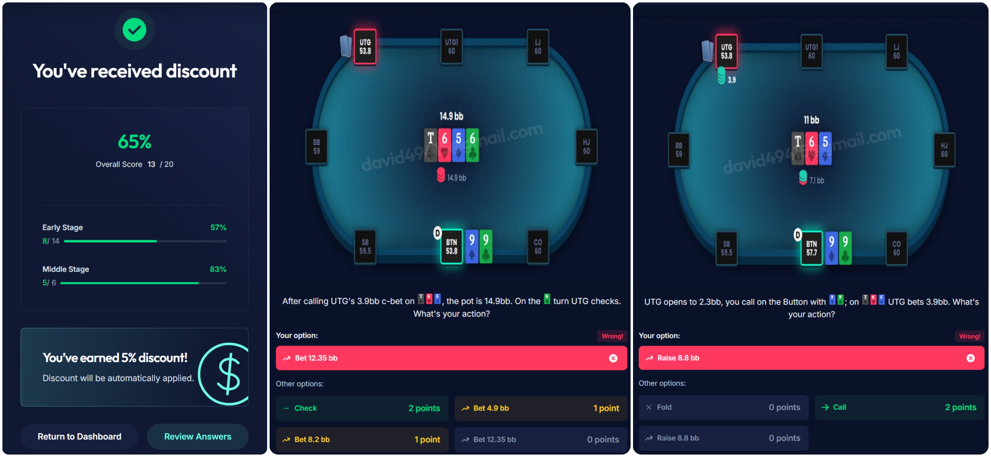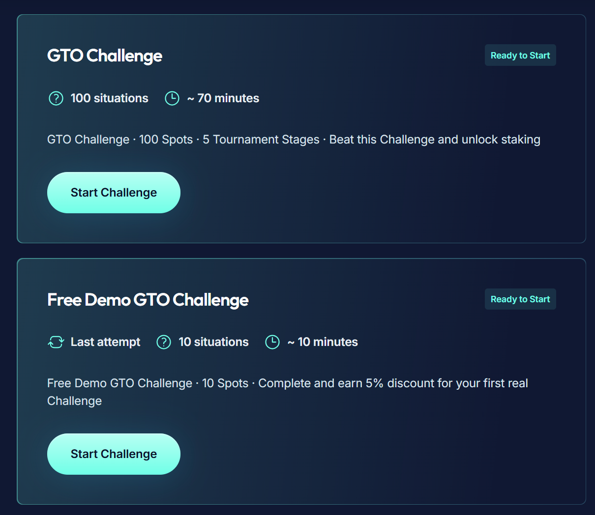 Bevor du an die echte Challenge gehst, empfehlen wir, die Demo-Challenge auszuprobieren. Sie enthält 10 GTO-Spots und gibt dir ein Gefühl dafür, wie alles funktioniert. Nach dem Durchlaufen erhältst du wertvolles Feedback zu deinen Schwächen und einen 5% Rabatt auf die echte Challenge.