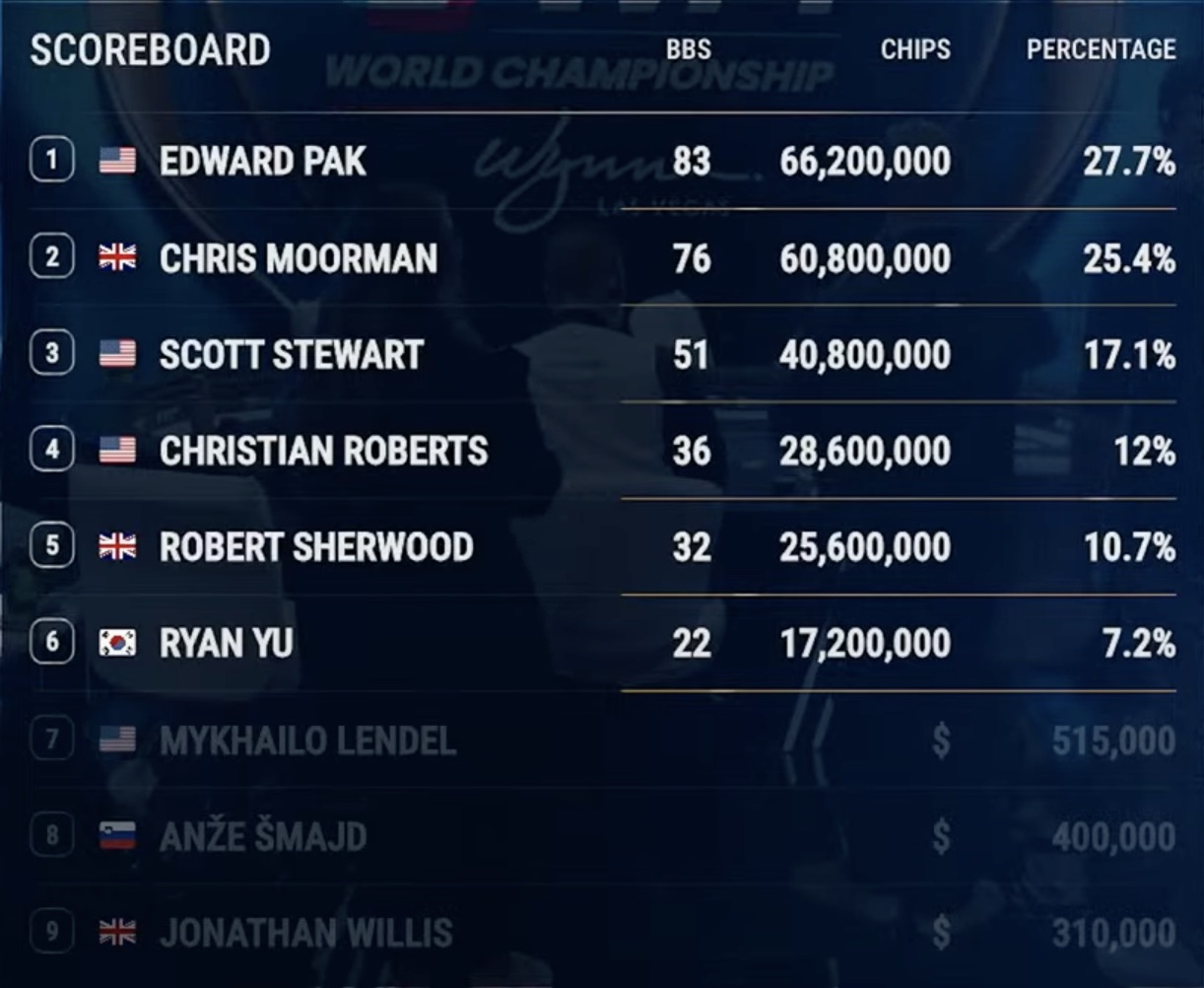 Gestern ging es darum, das Teilnehmerfeld auf die finalen sechs Spieler zu reduzieren, was erfolgreich gelungen ist. Eddie Pak führt die Finalisten mit einem Stack von 66.200.000 an, dicht gefolgt von Chris Moorman mit 60.800.000. Moorman erreichte in diesem Turnier im Vorjahr den 4. Platz und sicherte sich dabei knapp $2,1 Millionen – sein bisher höchster Karrieregewinn. Dieses Mal könnte er um den Sieg kämpfen.