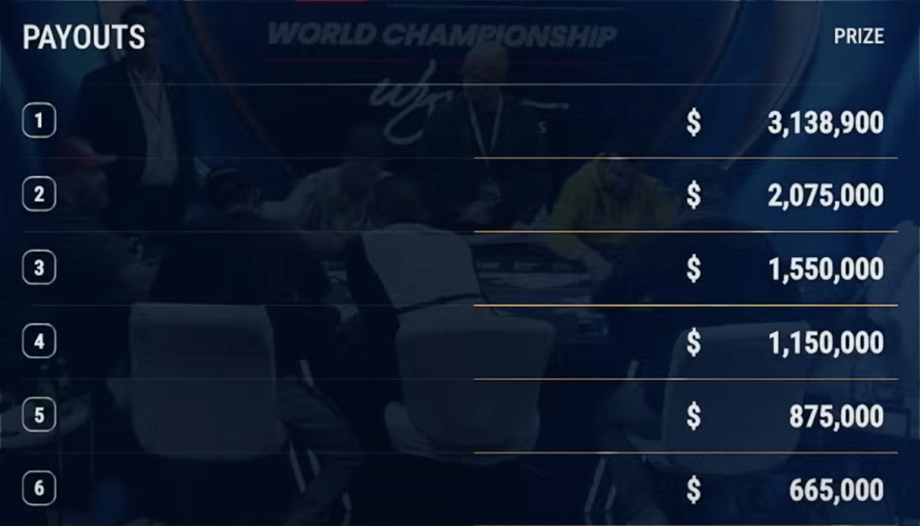 Das Turnier zog 2.392 Teilnehmer an, was zu einem Preispool von 23.441.600 $ führte. Der Gewinner darf sich über 3.138.900 $ freuen, inklusive eines $10.400-Tickets für die WPT-Weltmeisterschaft im nächsten Jahr.