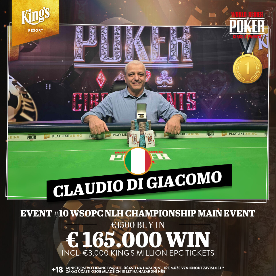 Im abschließenden Heads-up sicherte sich Di Giacomo gegen den Deutschen Stefano Aprile den Sieg. Dieser Kampf begann mit einem 3:2 Vorsprung des Italieners, jedoch wurden die Stacks schnell ausgeglichen und es folgte ein über eine Stunde dauerndes Duell. In der entscheidenden Hand am Turn Q d 9 c 6 s 3 h schob Aprile seine letzten 10bb mit 9 d 7 d in die Mitte. Doch Di Giacomo drehte K d K h um. Der River brachte weder eine Neun, noch eine Sieben, somit stand der Sieger fest – Stefano Aprile als Zweiter erhielt 111.000€, während der Titel samt Ring und 165.000€ an Claudio Di Giacomo gingen. Herzlichen Glückwunsch!