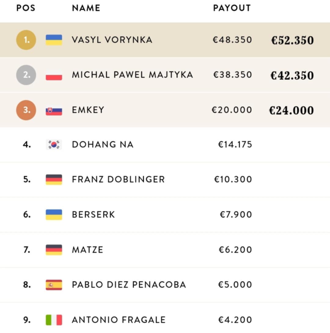 Am Ende landete Dohang Na auf dem 4. Platz. Marián "eMKey" Kubiš sicherte sich den dritten Rang und ein Preisgeld von €20.000. Das Finale gipfelte im Heads-up zwischen Michal Majtyka und Vasyl Vorynka.