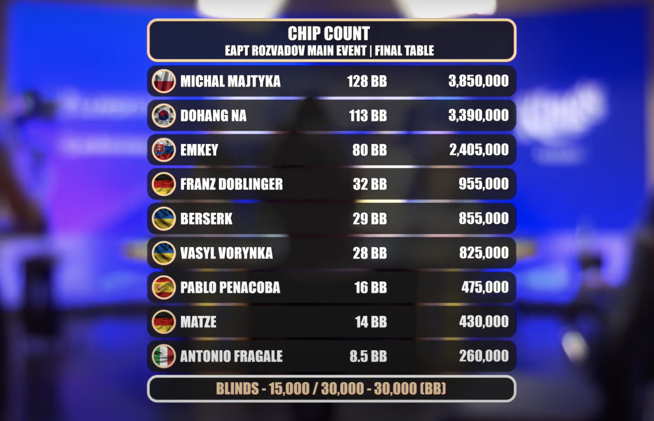 15 Spieler starteten am Finaltag des Turniers, angeführt vom Koreaner Dohang Na. Knapp hinter ihm folgte der Slowake Marián "eMKey" Kubiš, während Michal Majtyka den drittgrößten Stack hielt. Diese drei Spieler dominierten und schafften es gemeinsam an den Finaltisch, wo Michal Majtyka als Chipleader startete. Auch die deutschen Spieler hinterließen ihre Spuren: Franz Doblinger erreichte Platz 5 und gewann €10.300.