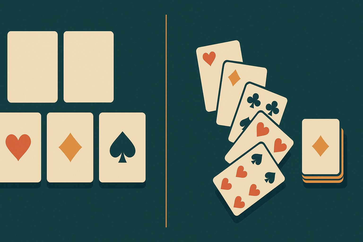- Flush – All five cards of the same suit (not in sequence) - Example: ♦️2 – ♦️6 – ♦️J – ♦️8 – ♦️10
