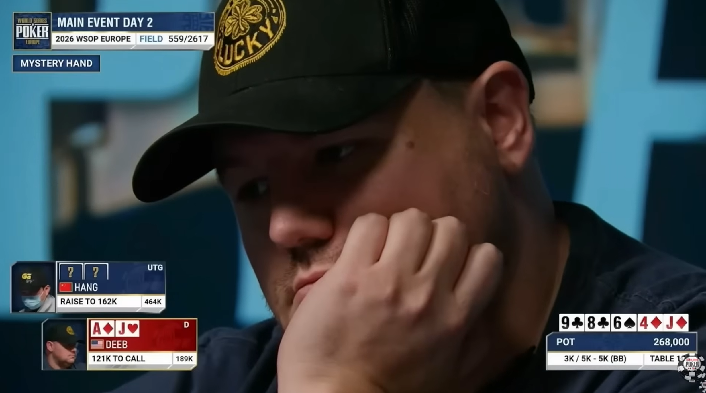 The second hand features Shaun Deeb, who was on a hot streak, with two runner-up finishes and a strong position in the WSOP Player of the Year race. Deeb calls on the button with A d J h against an open raise from UTG. On the flop 8 c 6 s 9 c, he tries to take the initiative with a bet. After a check-check turn 4 d, the river J d gives him top pair, top kicker. It seems like an ideal card for a thin value bet, but Negreanu precisely shows how treacherous situations are when your range seems strong at first glance but is actually capped. That's when a 'good river' becomes a minefield.