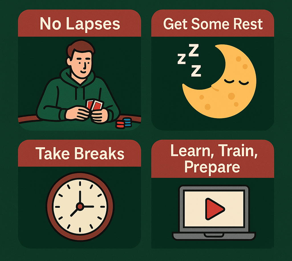 Staying alert for hours on end can be exhausting. Luckily, tournaments usually have scheduled breaks, and in cash games, you can step away whenever you need. Take advantage of these breaks whenever possible! Even a short pause can help you stay fresh, focused, and make better decisions at the table.