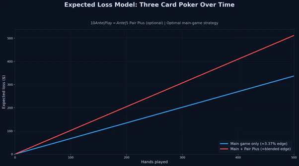 That is a 50% increase in expected loss just from the side bet. Over time, variance will mask this. You might win a session. But the math is stable across large samples. That is why Three Card Poker is not beatable long term.