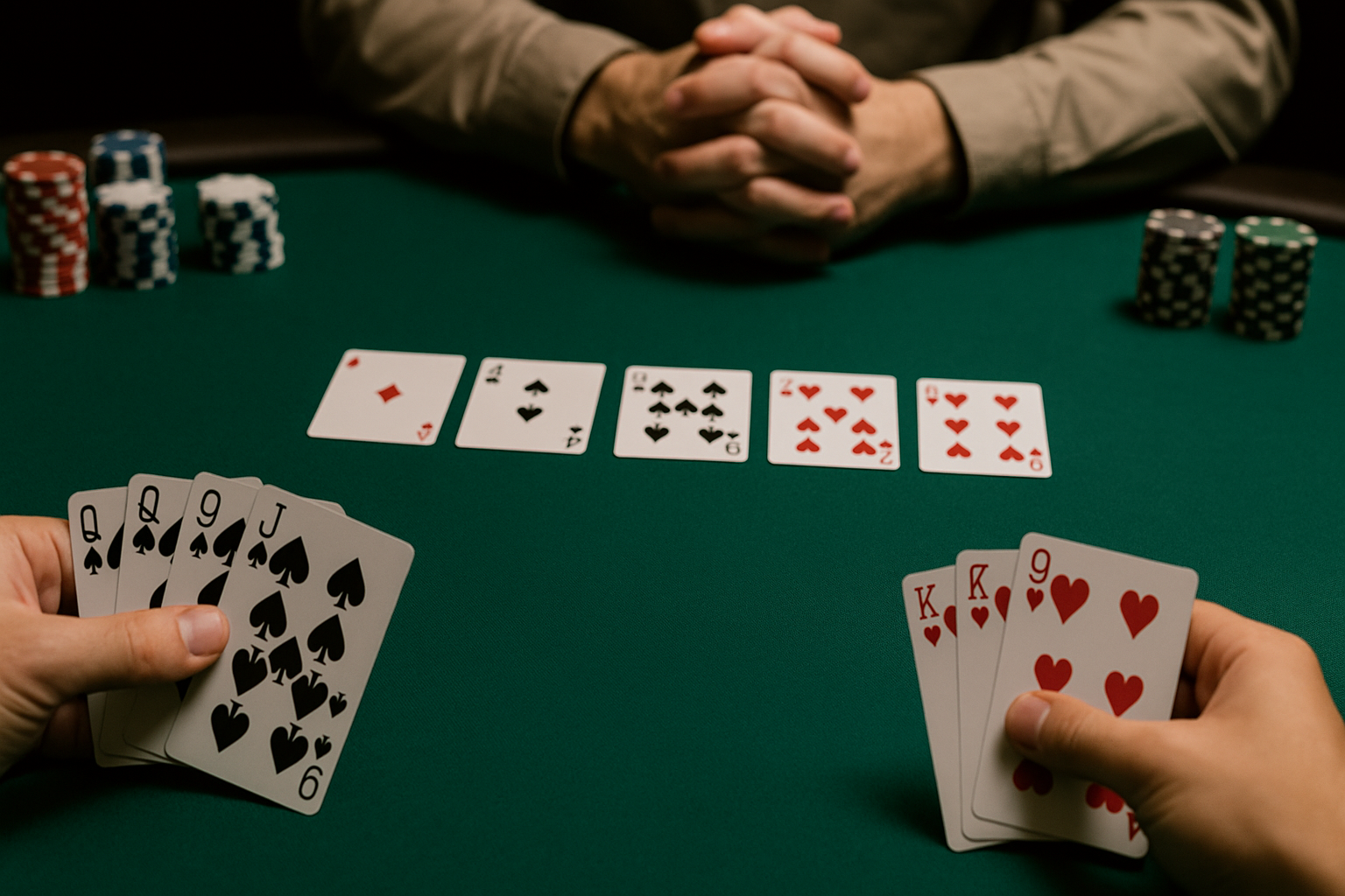 This variant is very open. You see most of your opponents’ cards. This makes bluffing harder but not impossible. It also puts more focus on reading the board and understanding how strong you are compared to others.